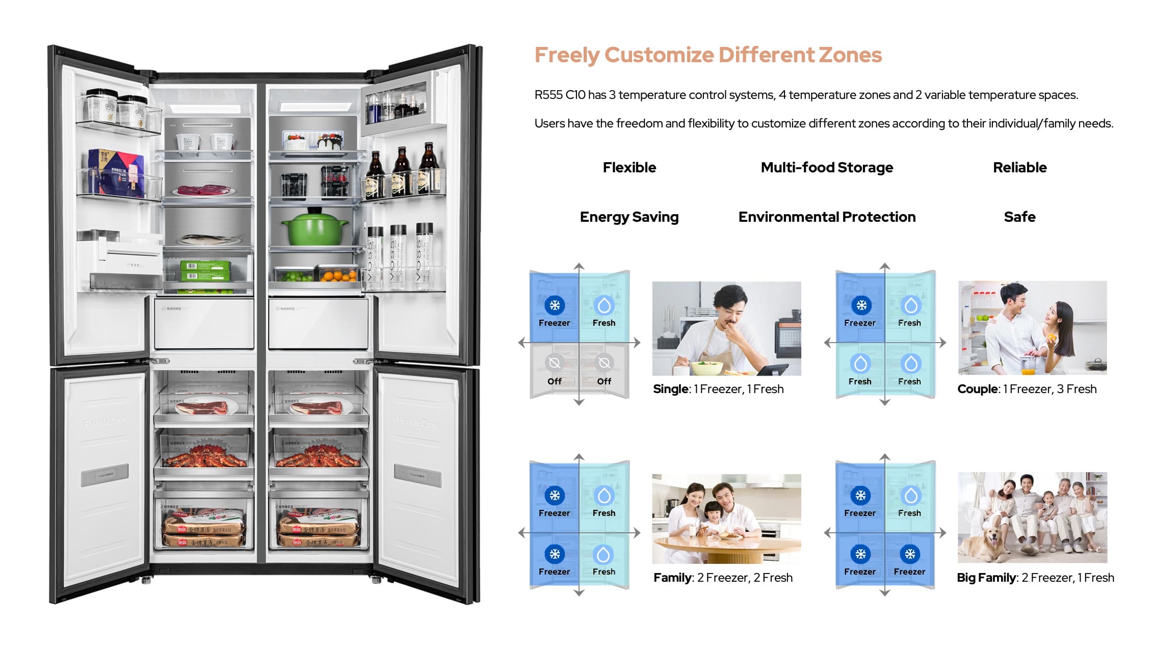 TCL 格物系列R555 C10冰箱搭载了行业首创的多变存储空间和多变门体结构,采用3系统4温区,各区可独立调节,能够满足不同人群、季节、地域等对于食品保鲜存储的差异化需求。同时在存储分类、健康保鲜、杀菌净味、节能环保上都做了很多人性化的细节体验。设计遵循TCL灵感自然美学,采用复式对称结构,为冰箱增添了新的魅力。