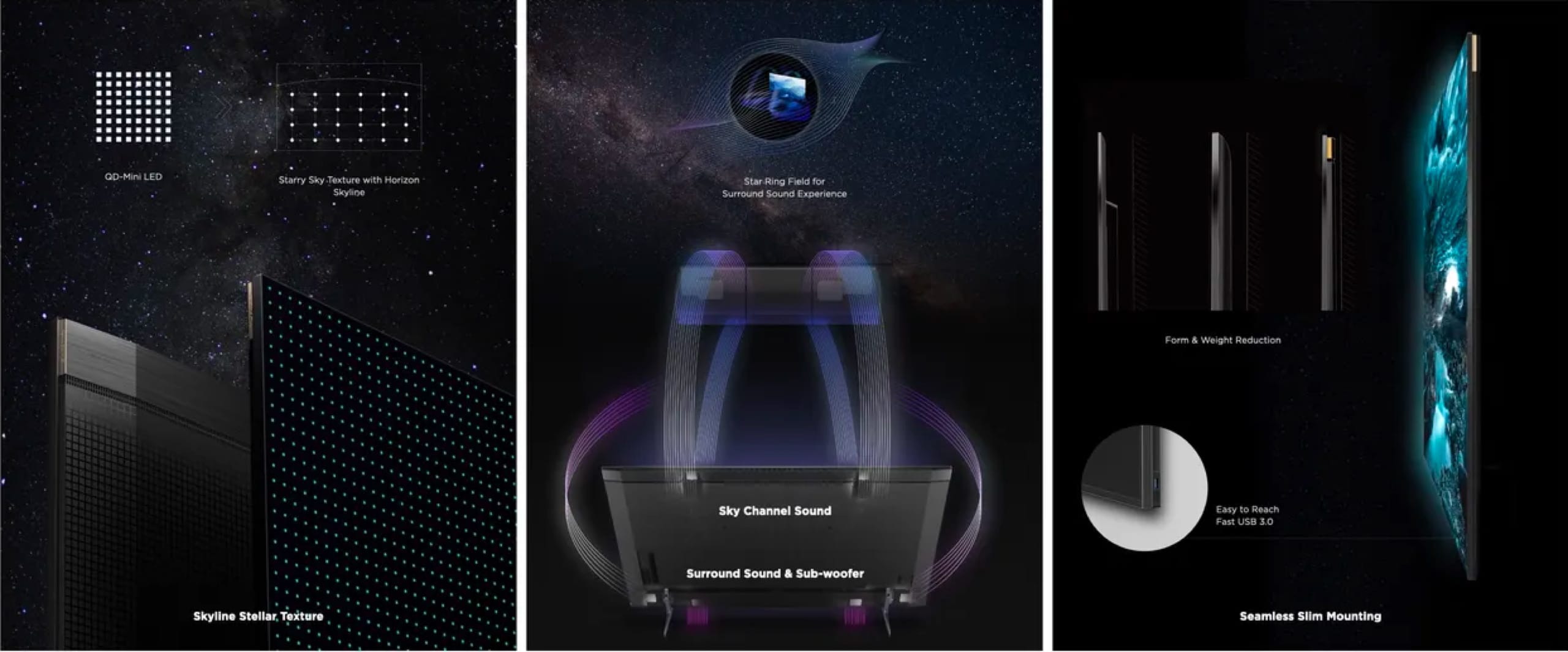 该产品采用了Mini LED和量子点等高新技术,实现了超窄的前边框,优先展示出美丽的图像,与其无缝设计相得益彰。除了精致的前部设计没有任何装饰,它还充分考虑了线缆管理和薄机身内各种接口的可用性。虽然外观极简,但这种设计展现了高水平的技术水准。