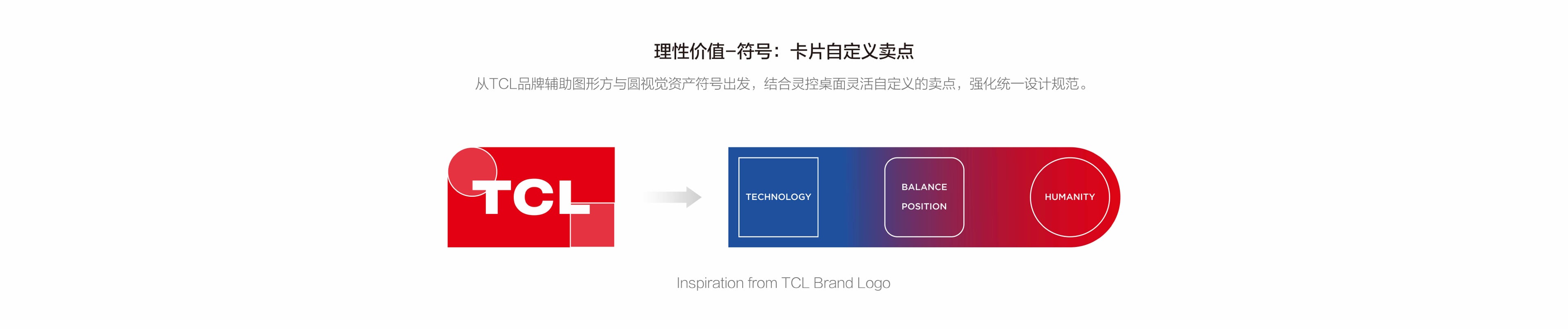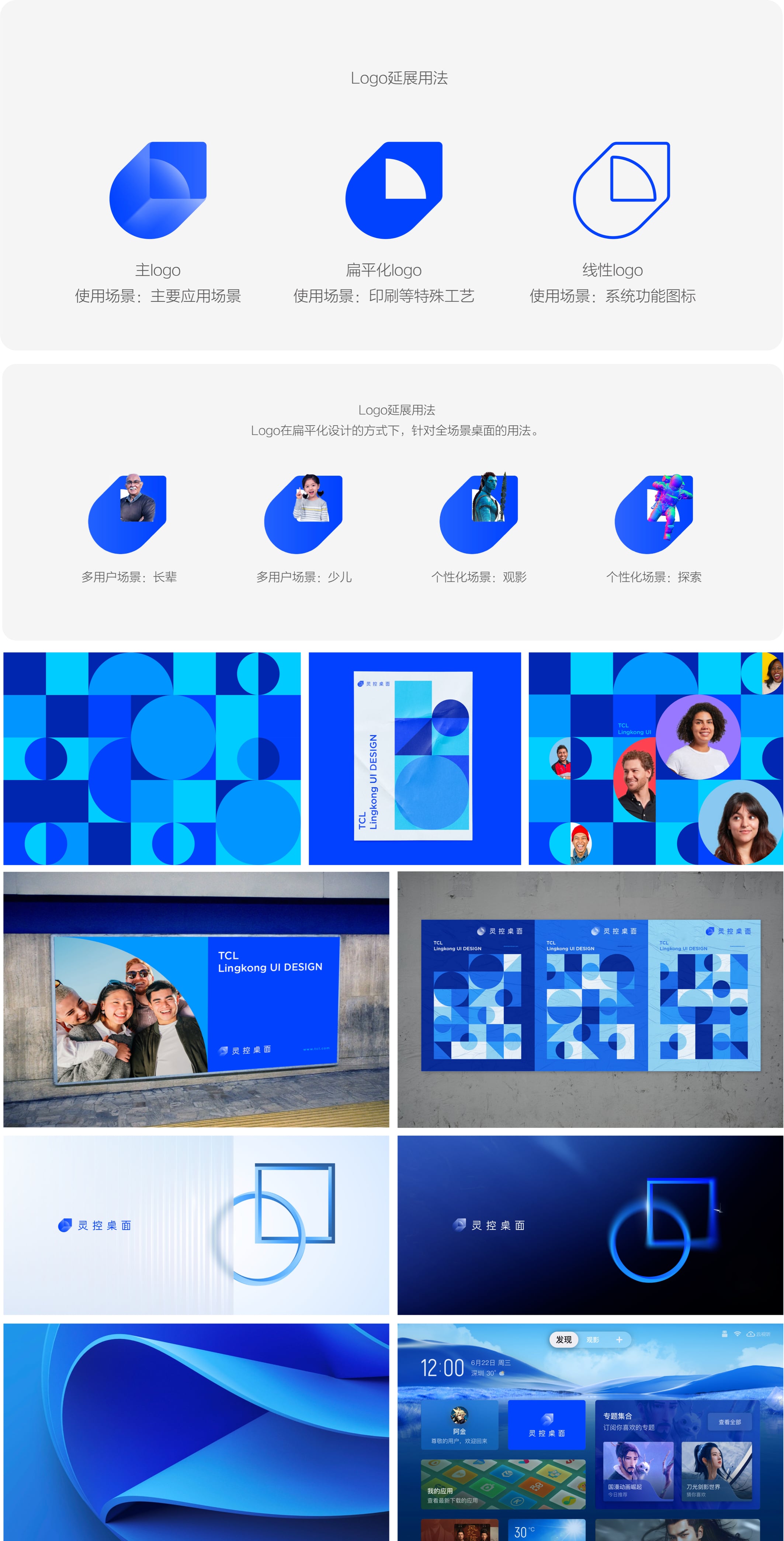 作为一家深耕智屏行业40年的企业,TCL一直致力于创造智慧科技,为产品体验赋予温度和情感。我们颠覆电视行业现有的使用体验,创作灵控桌面TV系统,将用户从冗杂的瀑布流信息和繁琐的频道交互中解放出来,以极简的方式满足用户多样化的诉求。在使用过程中静享疗愈之美,创造真实的、被需要的、有温度的极简设计。灵控桌面作为TCL集团电视界面的布局系统,在标志设计中我们从品牌资产中提取方与圆的设计元素融入到标志图形设计当中,使品牌视觉一致性。同时灵控桌面关键卖点是:通过高度自定义的桌面卡片生态,打造高端电视用户心目中的极简桌面,提取灵动、几何作为标志设计的情绪,灵动即灵活自定义;几何即卡片。