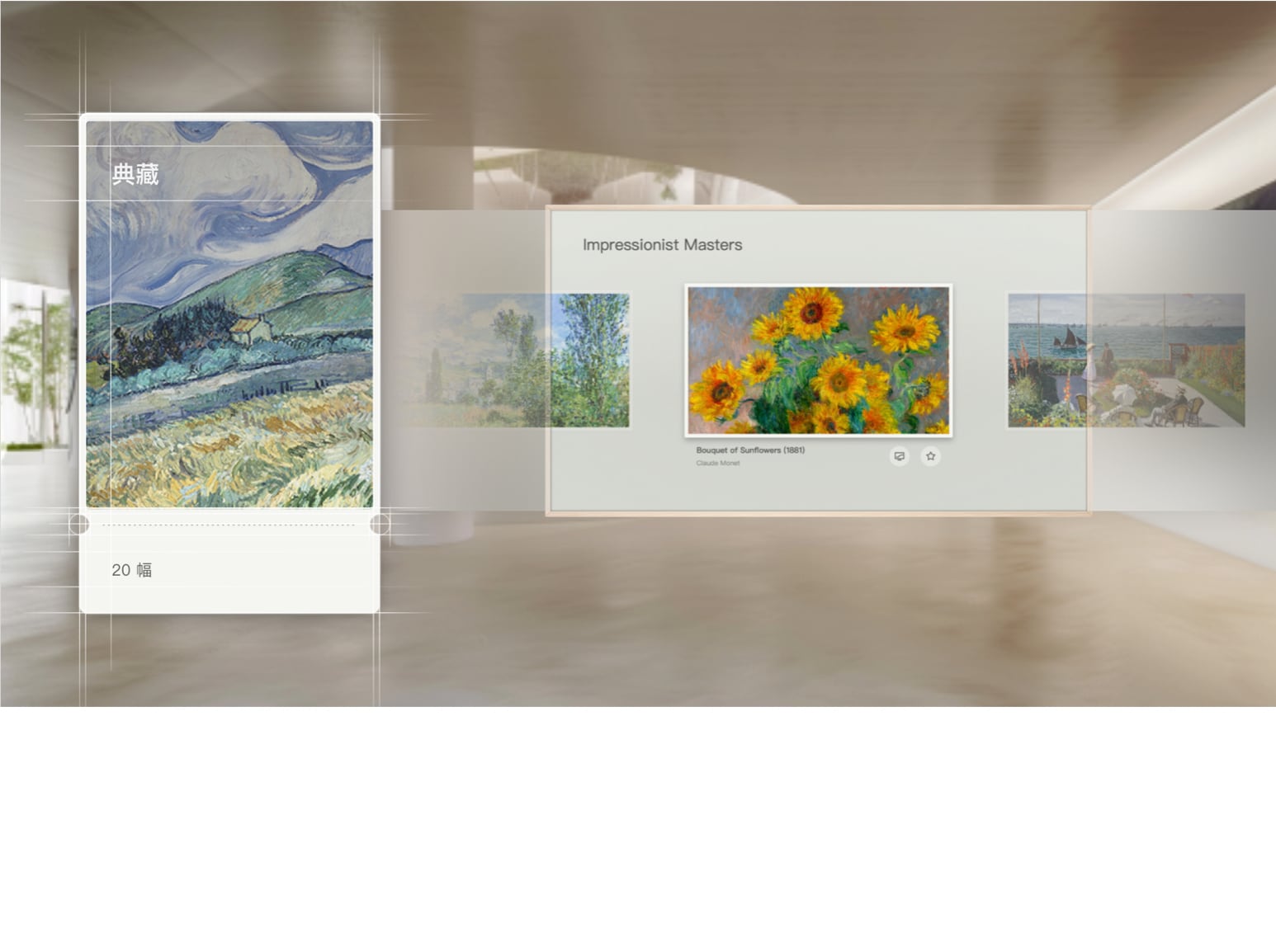 功能卡片的设计灵感来源于博物馆的入场票券,模拟人们进入博物馆后在艺术长廊中走动浏览的观赏体验,给予用户进入艺术世界的仪式感。