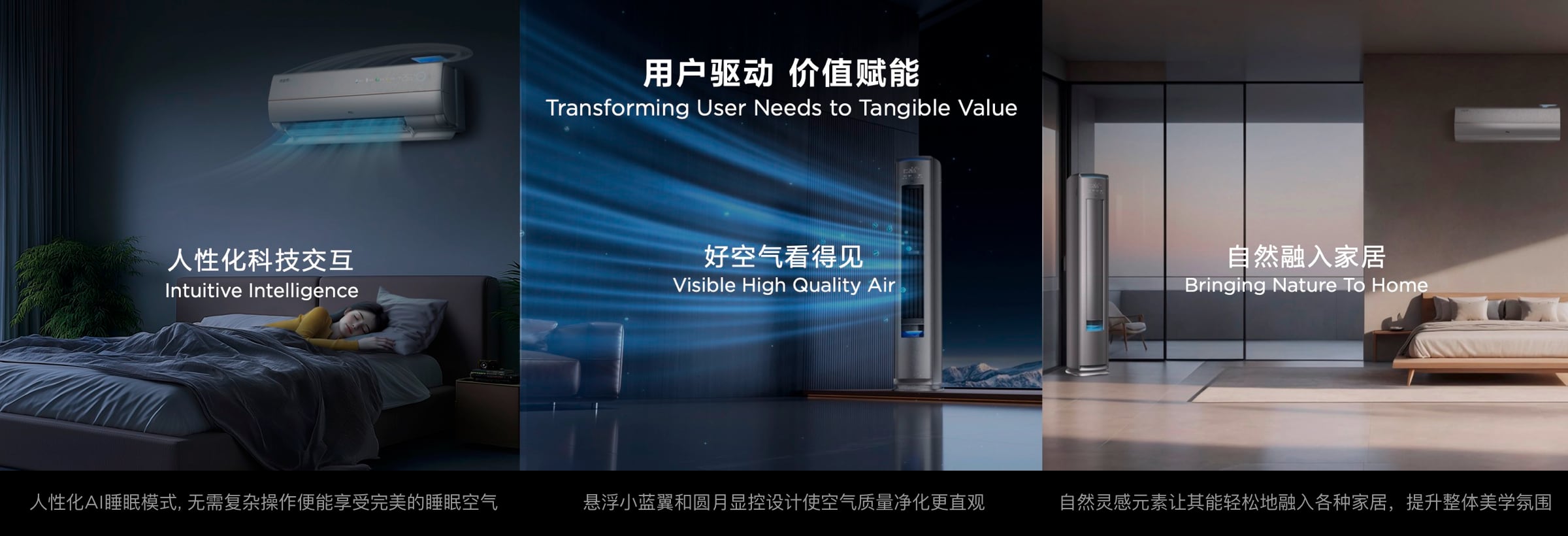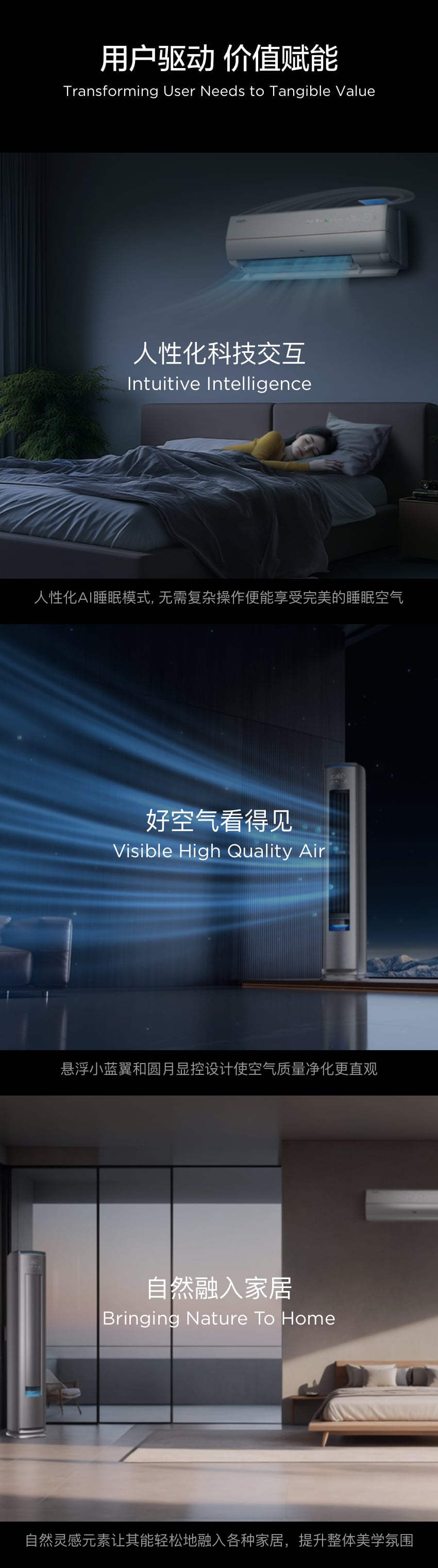 挂机空调融合自然曙光灵感,以一条金属中线划分机身,集成语音功能,成为智慧交互入口。归于静夜,始于晨曦,曙光寓意希望与新生,C7空调伴您舒适入眠,清新醒来,消除疲惫,迎接活力新一天。