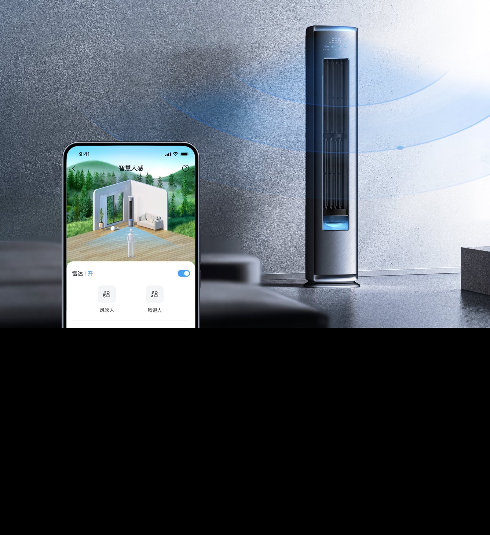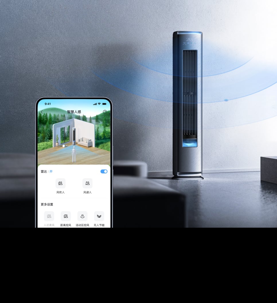 客厅作为家庭成员共享的空间,不同家庭成员对温度和风感的需求各异。为满足这些多样化的体感需求,小蓝翼C7柜机配备了毫米波雷达和声纹识别技术,能够精准判断用户的年龄、性别及所在位置,并据此自动调整风向和风力,以提供个性化的舒适体验。
