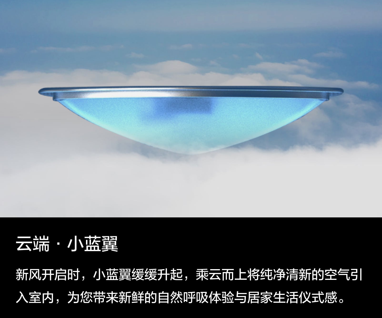 新风开启时,小蓝翼缓缓升起,乘云而上将纯净清新的空气引入室内,为您带来新鲜的自然呼吸体验与居家生活仪式感。