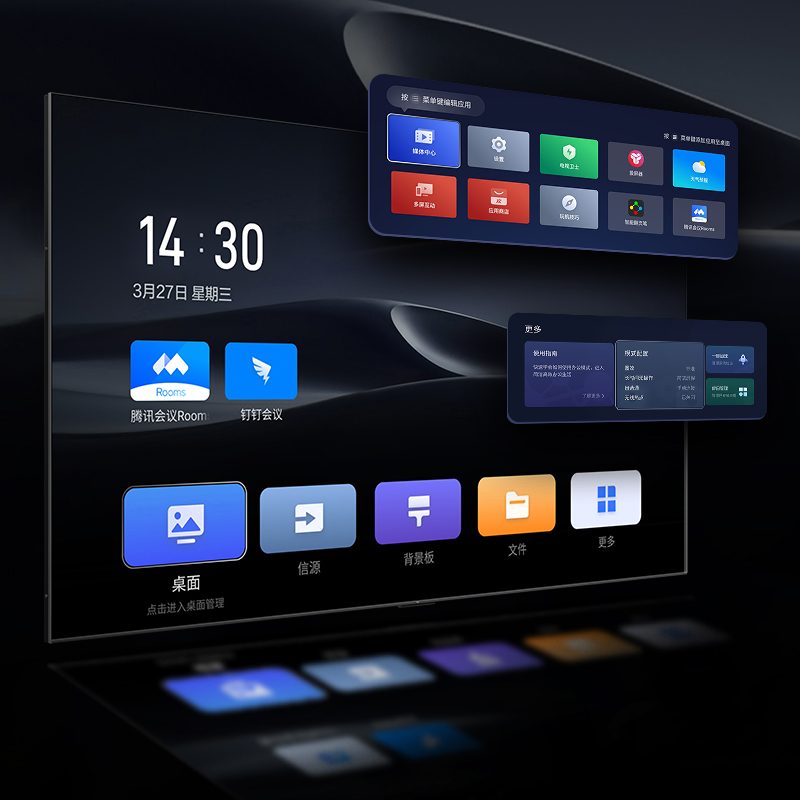 内置腾讯会议Rooms专属版、钉钉会议,无需连接电脑、无需投屏即可在大屏端开启视频会议,更便捷、更清晰、 更稳定;专属遥控器一键快速入会,可开启摄像头、麦克风、文件上/下翻页,便捷高效。
