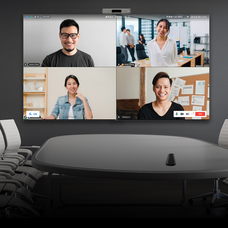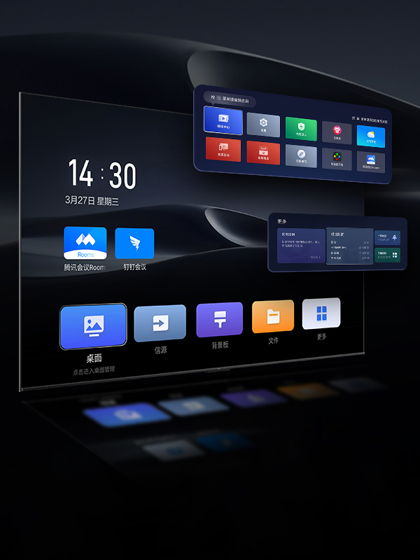 内置腾讯会议Rooms专属版、钉钉会议,无需连接电脑、无需投屏即可在大屏端开启视频会议,更便捷、更清晰、 更稳定;专属遥控器一键快速入会,可开启摄像头、麦克风、文 件上/下翻页,便捷高效。