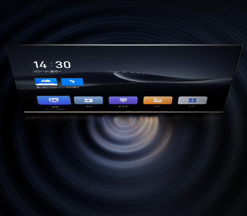 内置腾讯会议Rooms专属版、钉钉会议,无需连接电脑、无需投屏即可在大屏端开启视频会议,更便捷、更清晰、 更稳定;会议专属拾音算法,原声再现;专属遥控器一键快速入会,可开启摄像头、麦克风、文 件上/下翻页,便捷高效。