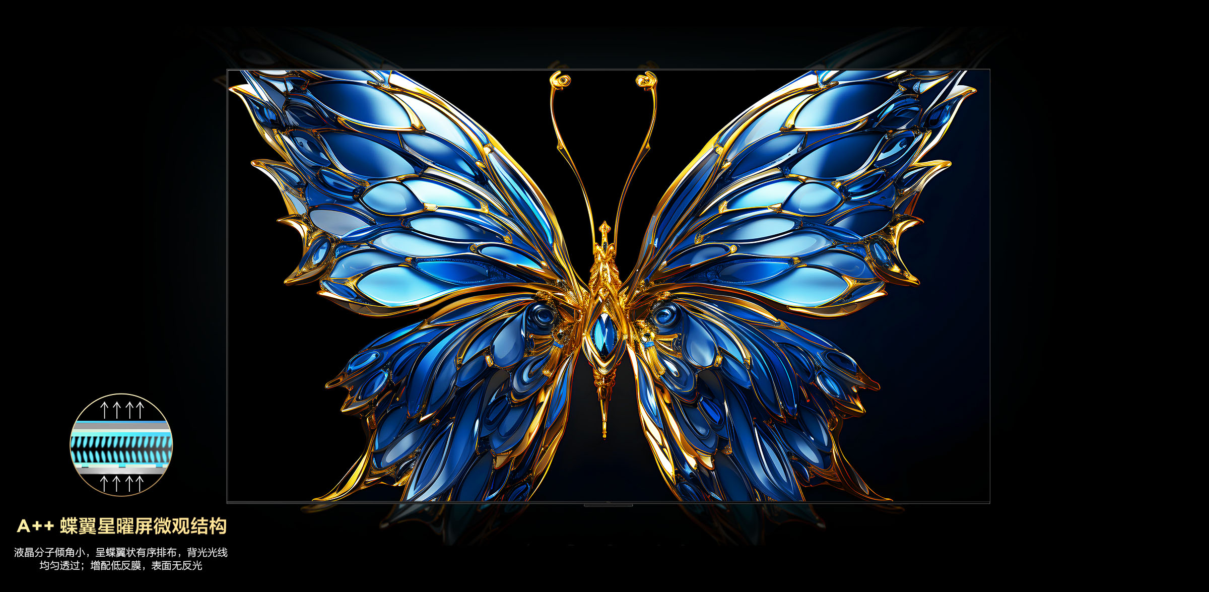 液晶层采用纳米级仿生科技,在液晶分子上增加聚酰亚胺,形成蝶翼状微结构,精准控制通过液晶层的光线,大幅提升对比度 ;同时搭载纳米级低反膜,降低屏幕反光,呈现的画面更通透,细节更清晰。
