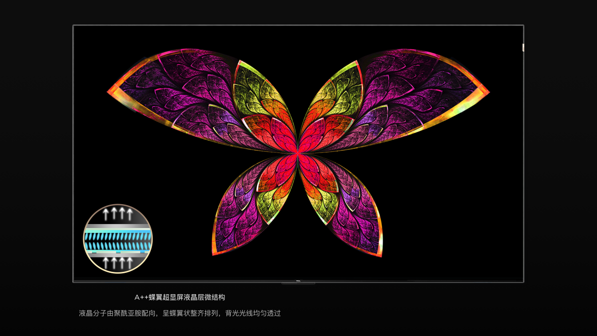采用纳米级仿生科技,在液晶分子上增加聚酰亚胺,形成蝶鬕状微结构,有效提升对比度的同时去除画面光晕及环境光干扰,呈现更加清浙、细节的惊艳画质。