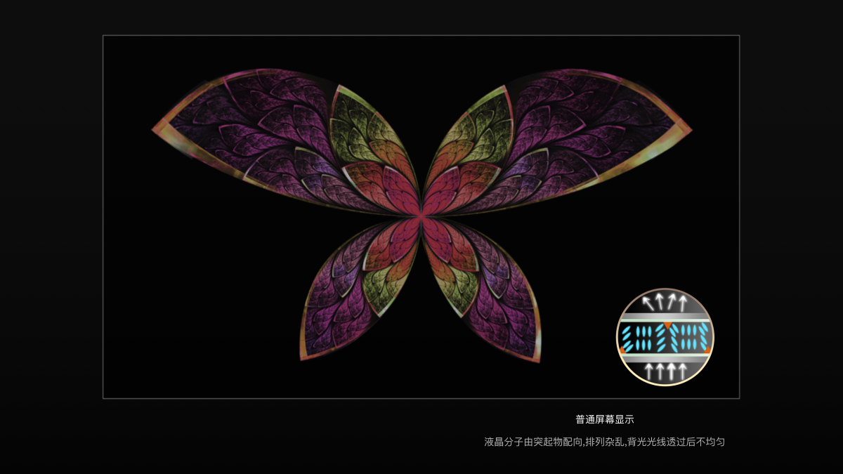 采用纳米级仿生科技,在液晶分子上增加聚酰亚胺,形成蝶鬕状微结构,有效提升对比度的同时去除画面光晕及环境光干扰,呈现更加清浙、细节的惊艳画质。
