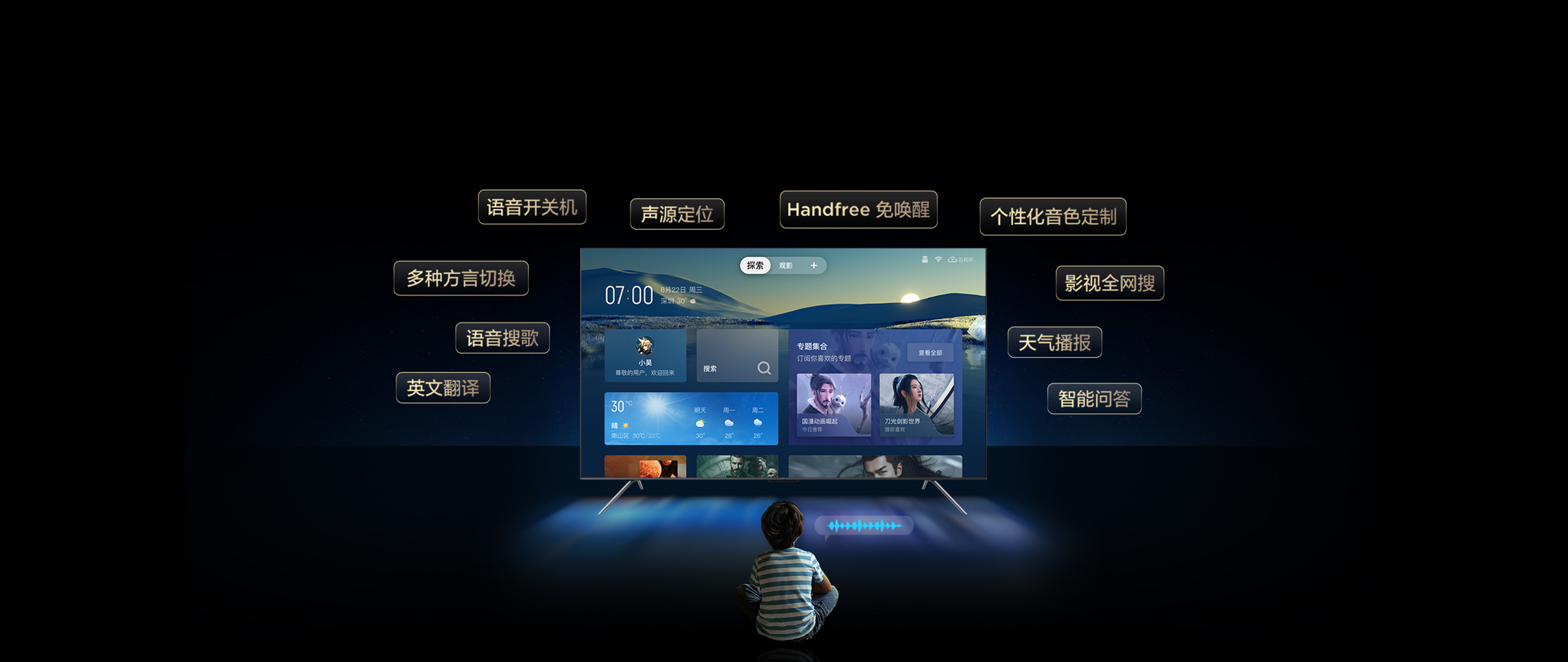 TCL “小T”语音助手支持远场语音免遥控声控,可实现语音开关机,特有Handfree 免唤醒技术,在特定场景下无需使用“小T小T”,直接下指令即可操控电视;更支持个性化音色定制,让你的声音随时陪伴家人。