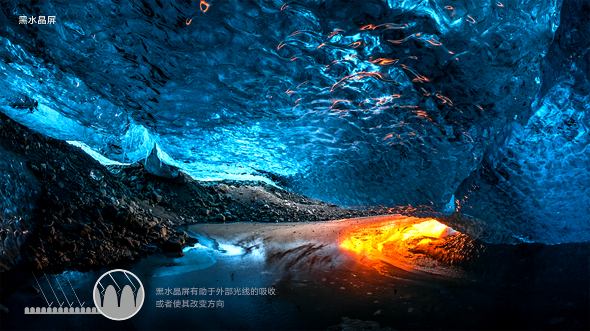 全新黑水晶屏体,有效吸收 97.35% 环境光。不论是阳光明媚的白天,还是灯光辉映的夜晚,都让你充分沉浸在影音世界。