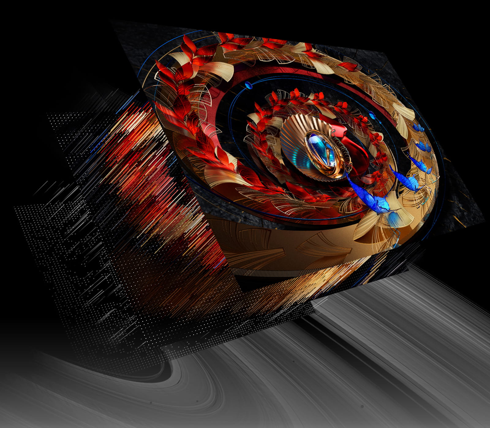 交错的纹理象征着超多背光分区,犹如颗颗繁星镶嵌在星野中,体现了 Mini LED 强悍的控光性能,美感天成。