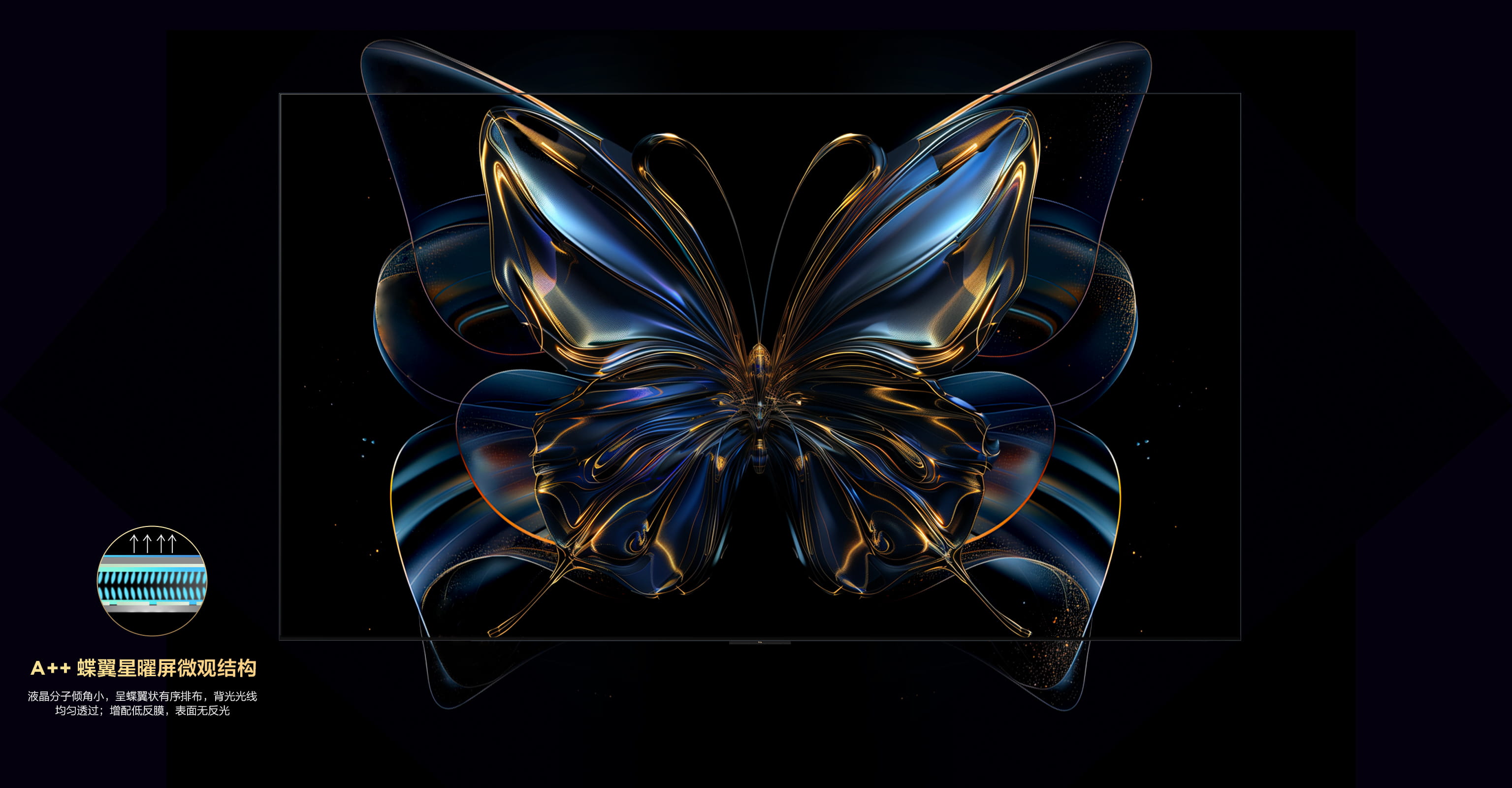 液晶层采用纳米级仿生科技,在液晶分子上增加聚酰亚胺,形成蝶翼状微结构,精准控制通过液晶层的光线,大幅提升对比度;同时搭载纳米级低反膜,降低屏幕反光,呈现的画面更通透,细节更清晰。