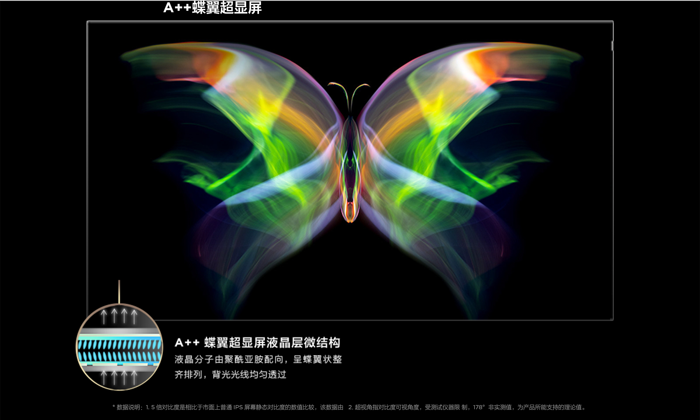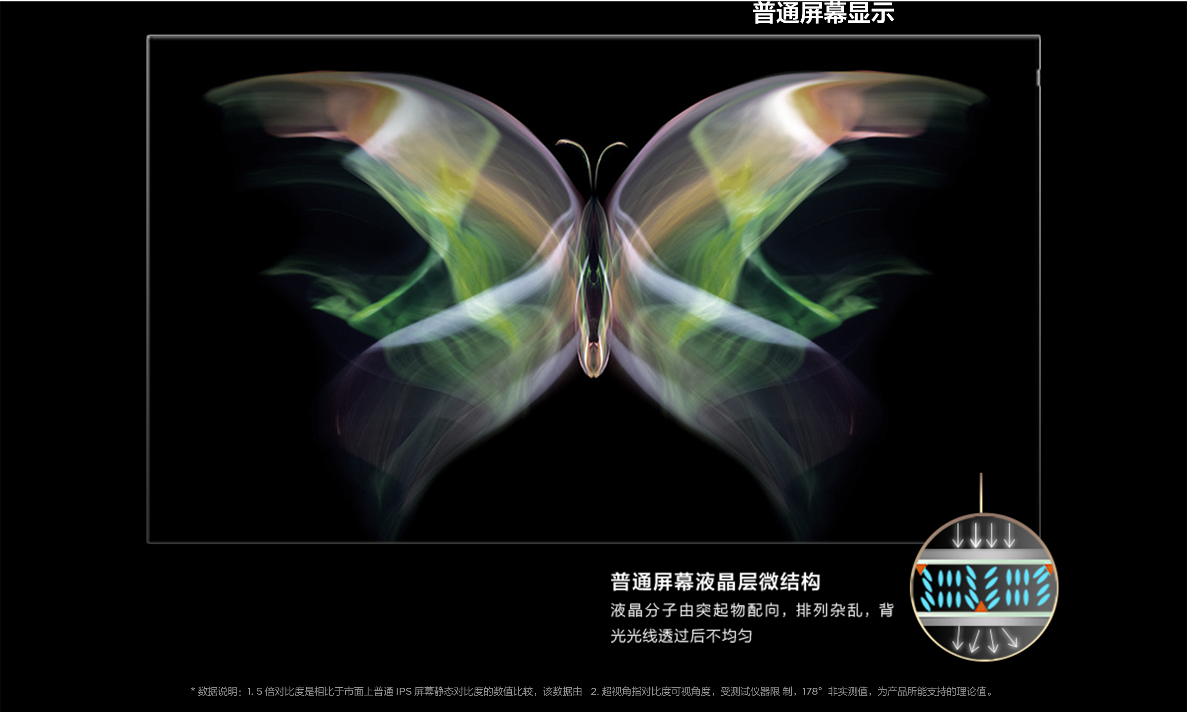 采用纳米级仿生科技,在液晶分子上增加聚酰亚胺,形成蝶翼状微结构,有效提升对比度的同时