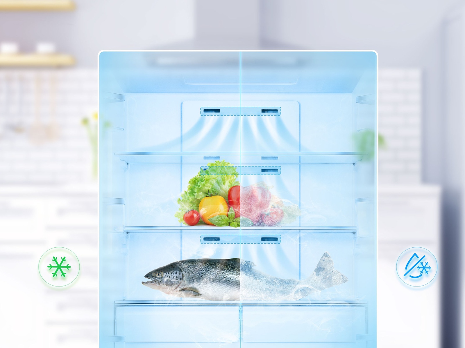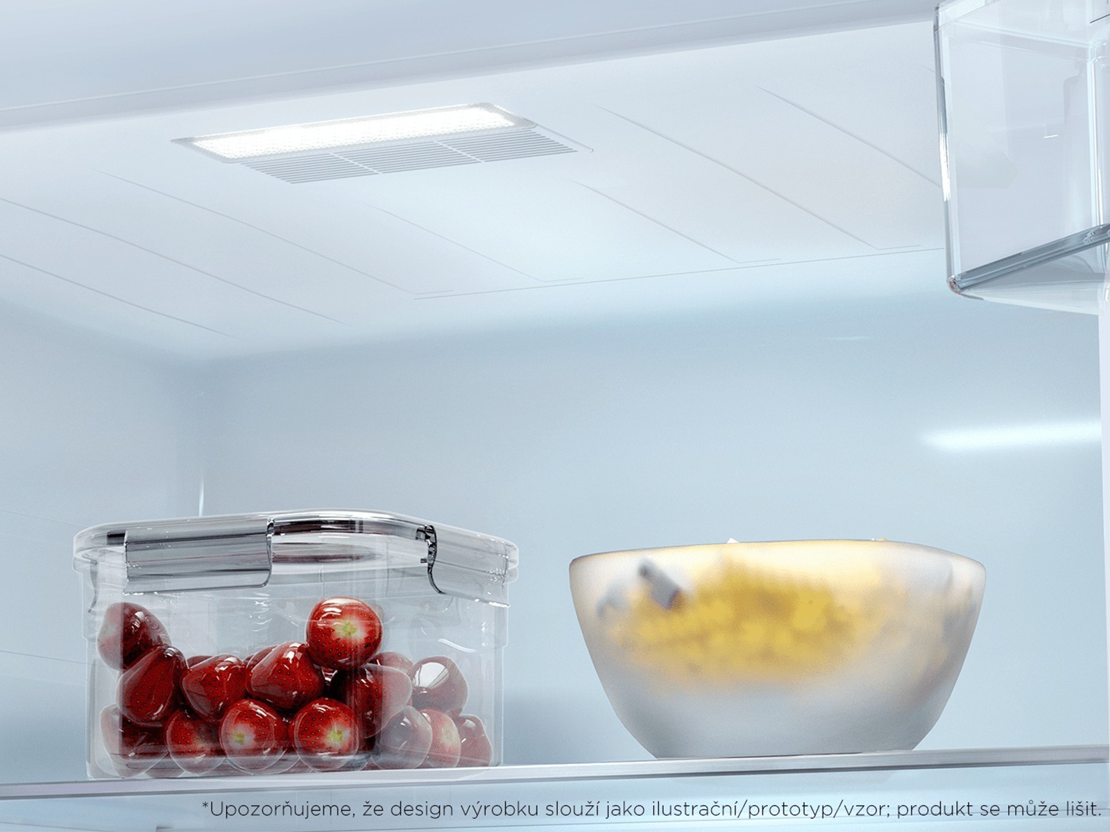 Studený vzduch je rovnoměrně distribuován v celém prostoru chladničky. Lepší cirkulace vzduchu a rychlejší návrat k cílové teplotě zaručují lepší konzervaci potravin.