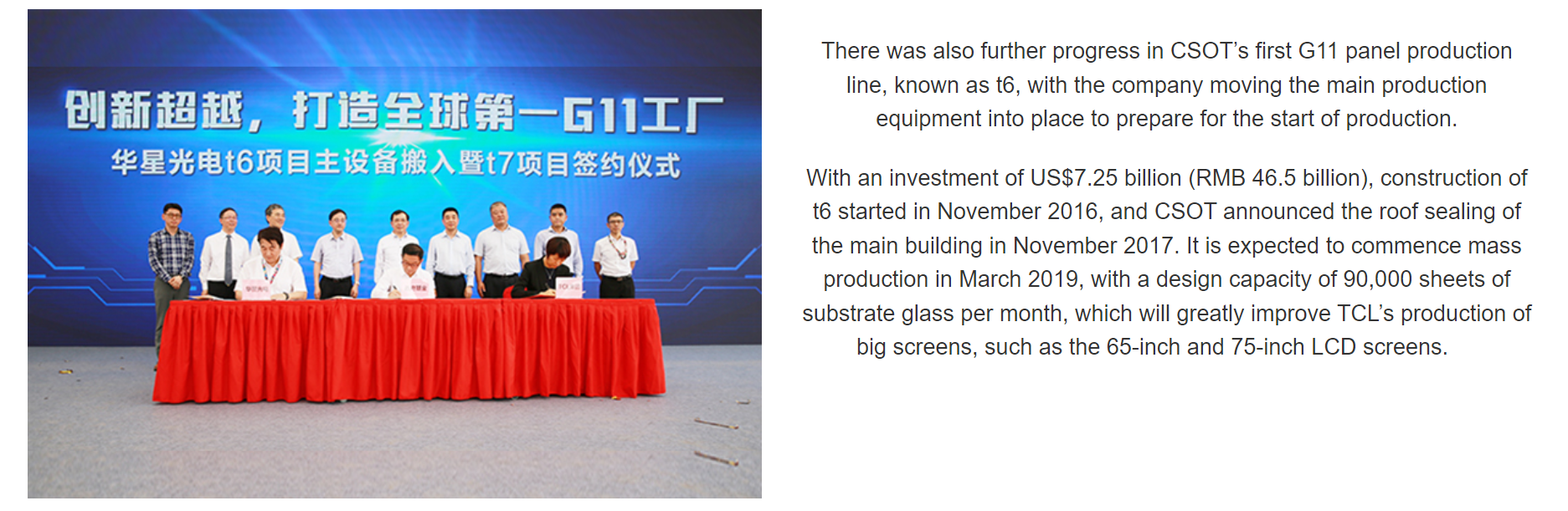In May 2018, CSOT announced its latest joint investment of US$6.55 billion (RMB 42.68 billion) in the second, 11th generation (“G11”) panel production line in Shenzhen, China, known as t7, revealing TCL’s vision for 8K products and the high value-added market.