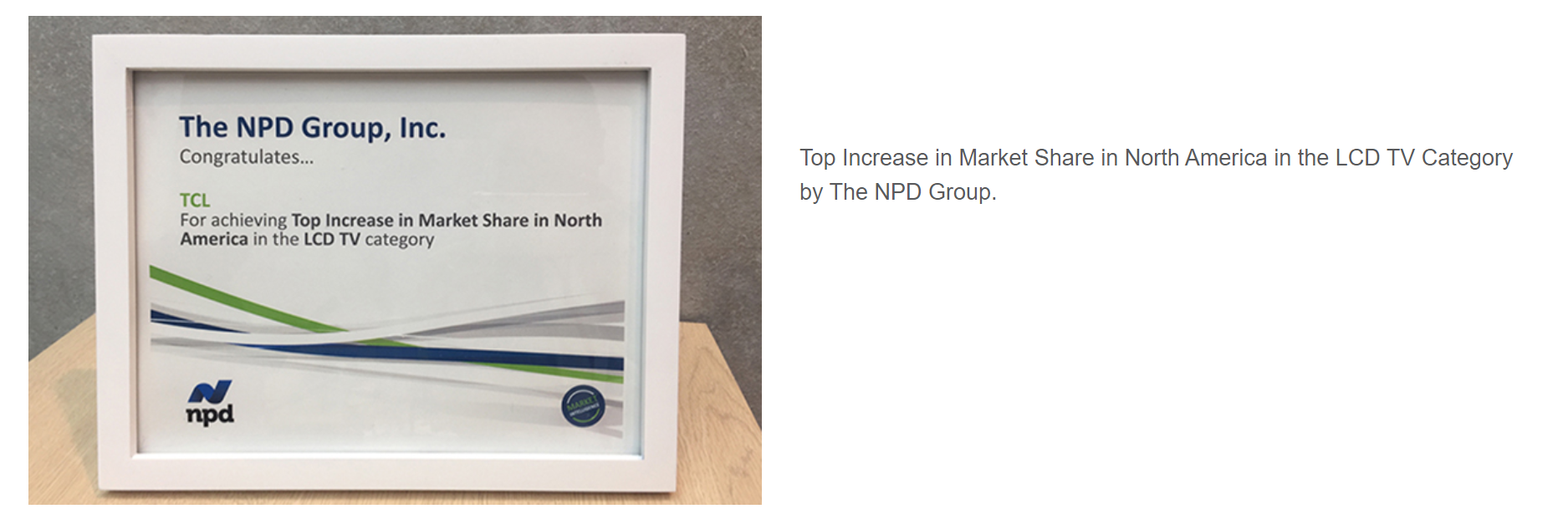 January 11, 2018, Las Vegas: TCL, one of the world's leading consumer electronics brands, has been awarded multiple honors at the 2018 International Consumer Electronics Show (CES) in Las Vegas. Most notably, TCL won 2017-2018 Global Top 50 CE Brands by International Data Group (IDG) and Top Increase in Market Share in North America in the LCD TV Category by The NPD Group.
