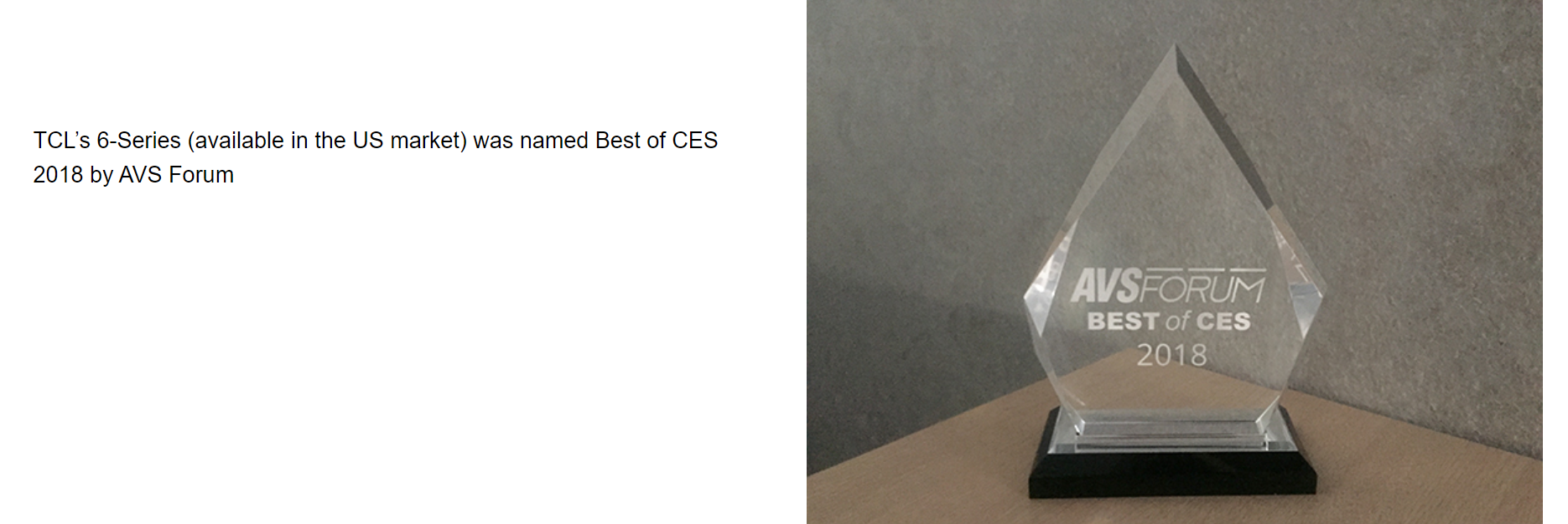 In addition, TCL’s 6-Series (available in the US market) was named CES Editors’ Choice by Reviewed.com and Best of CES 2018 by AVS Forum, while TCL’s flagship QLED TV X6 was also named a CES 2018 Innovation Awards Honoree.