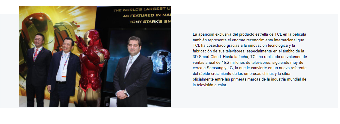 La asociación de TCL con Marvel para promocionar la próxima película de la casa, Iron Man 3, en la que se incorporan productos de la marca y se realiza publicidad, se anunció en la CES 2013 (Consumer Electronics Association) contando con Li Dong Sheng, presidente y director ejecutivo de TCL Corporation y Bob Sabouni, vicepresidente ejecutivo de relaciones internacionales de marketing de Marvel Entertainment entre los asistentes. Se ha hecho público el papel de TCL como socio oficial a nivel mundial para la promoción de canales de distribución y marketing de Iron Man 3 de Marvel, lo cual supone otro hito para TCL en su labor de marketing dentro de la industria del entretenimiento. Con su gigantesco televisor de 110 pulgadas elegido por el propio Tony Stark como su Smart TV en la película Iron Man 3, TCL ha integrado a la perfección una vez más su tecnología de vídeo y comunicación en el mundo del entretenimiento.
