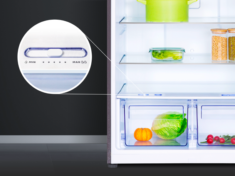 2 large drawers for fruits and vegetables with humidity sliders, allowing to adjust the required humidity according to the type of food for an optimal conservation.