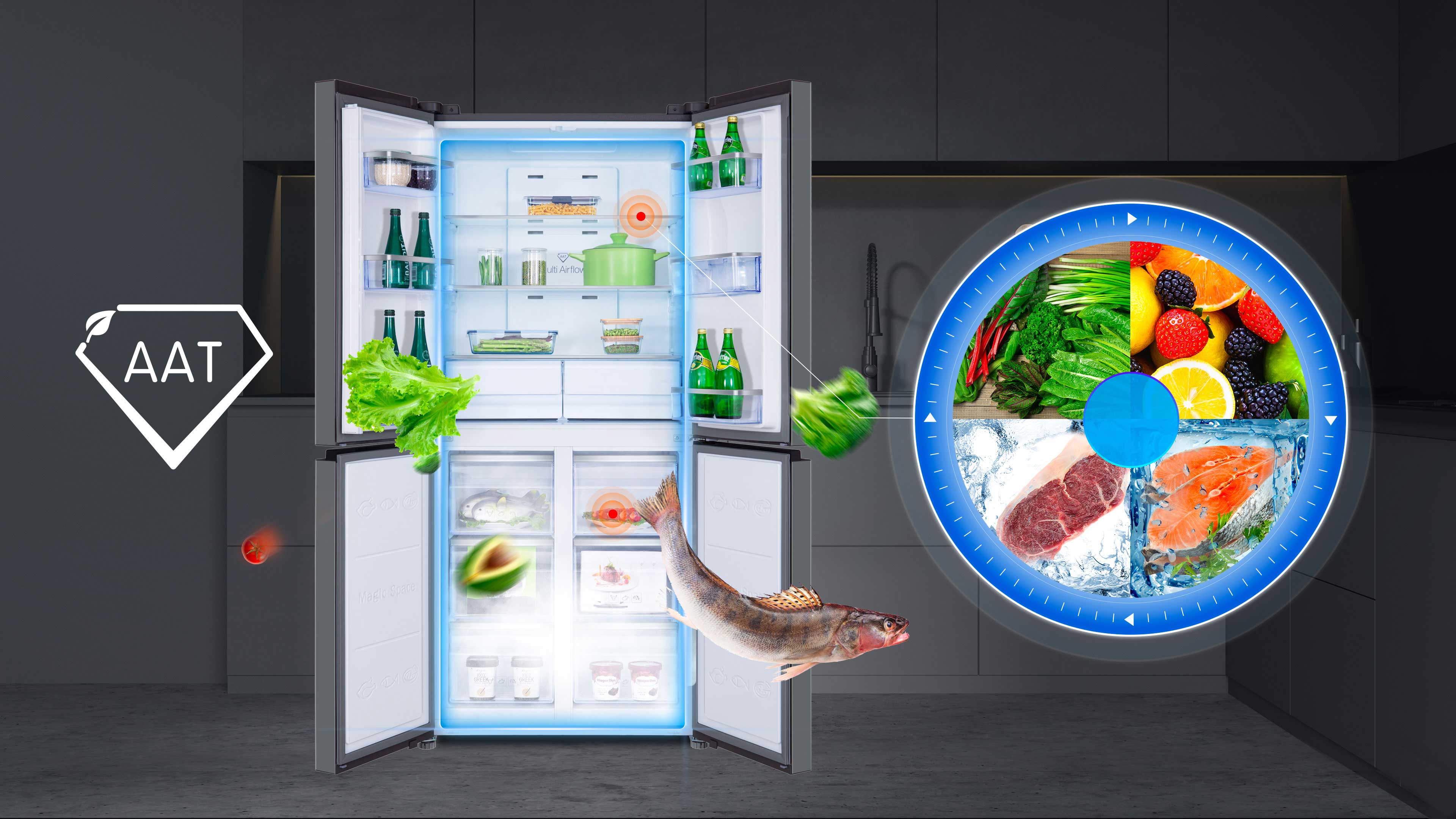 Prolong freshness and reduce odours with TCL AAT technology. Use of a natural tourmaline ore as a raw material, ground into powder in the refrigerator lining to spontaneously and permanently release a large number of negative oxygen ions to form a natural cold chamber in the refrigerator.