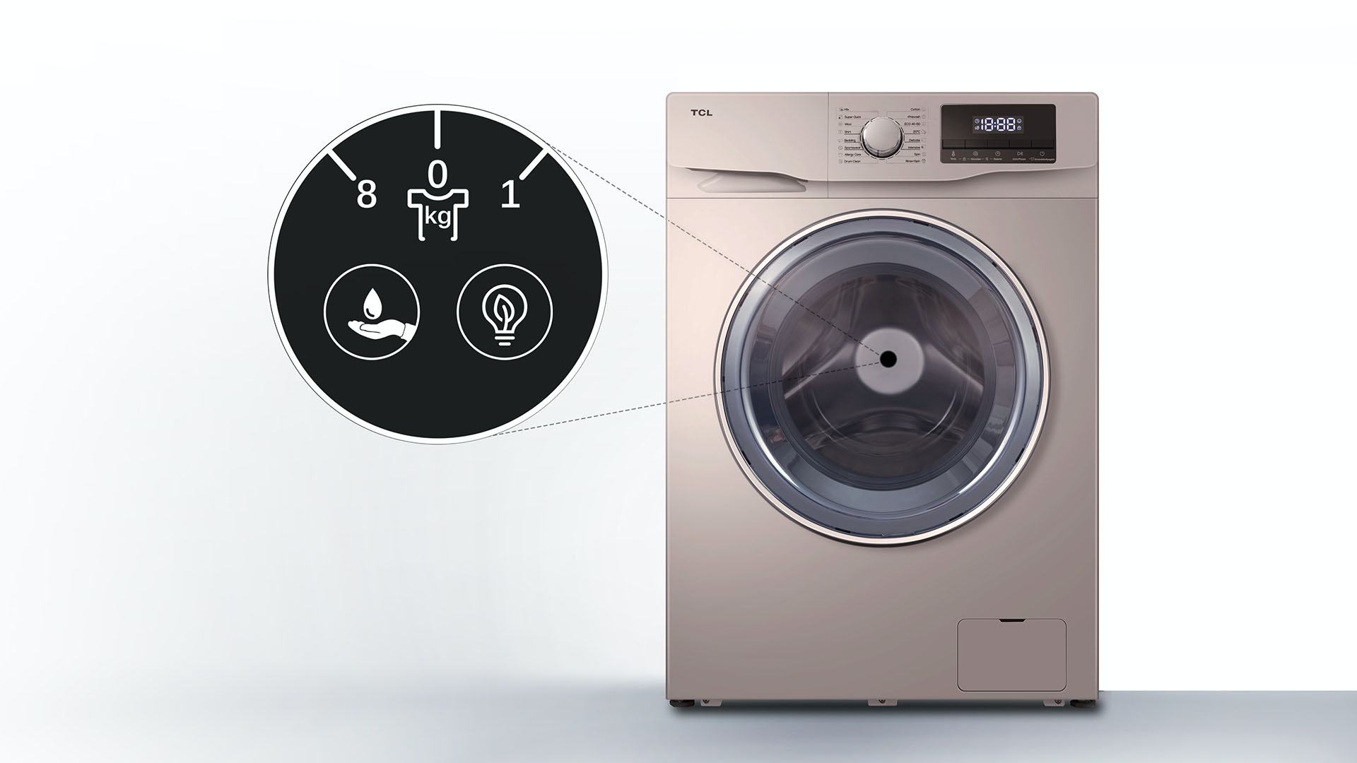 TCL washing machines use digital internal scales to weigh your laundry, before automatically adjusting the water consumption and cycle duration according to the amount of laundry you're washing. The machine calculates the optimum settings depending upon the weight of each load, ensuring excellent results and minimum energy consumption.