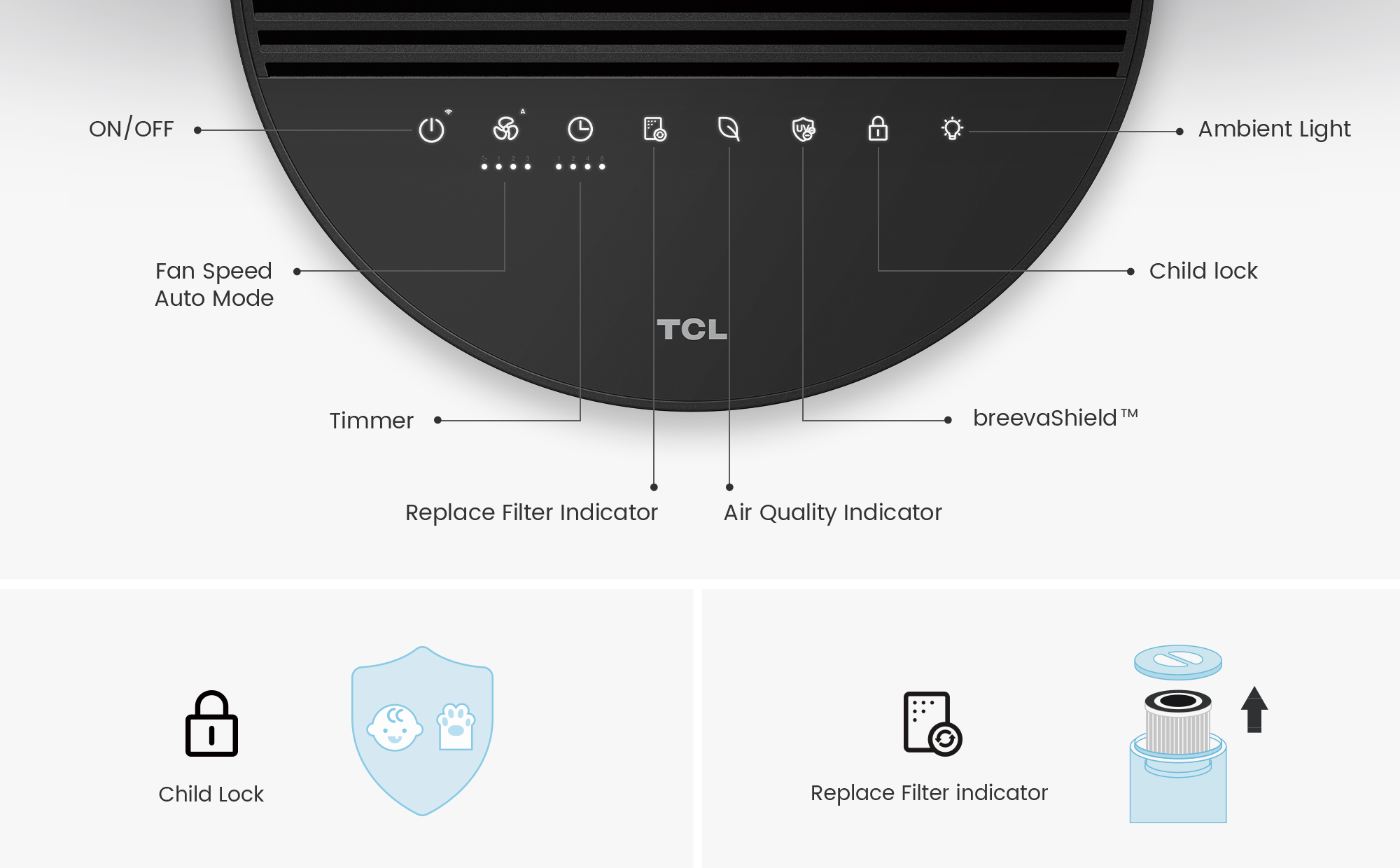 Pre-filter captures larger particles,such as dust, pet hair, fines, flocs, etc; HEPA H13 filter, specified by European Union EN1882, captures 99.97% of airborne particles as small as 0.3μm The 3rd filter - activated carbon absorbs odor and VOC. The 4th protection – Breeva Shield TM Anion makes the finer particles in the air agglomerate and settle. The 5th protection- Breeva Shield TM UV-C sterilization destroy the DNA and RNA of bacteria and virus.