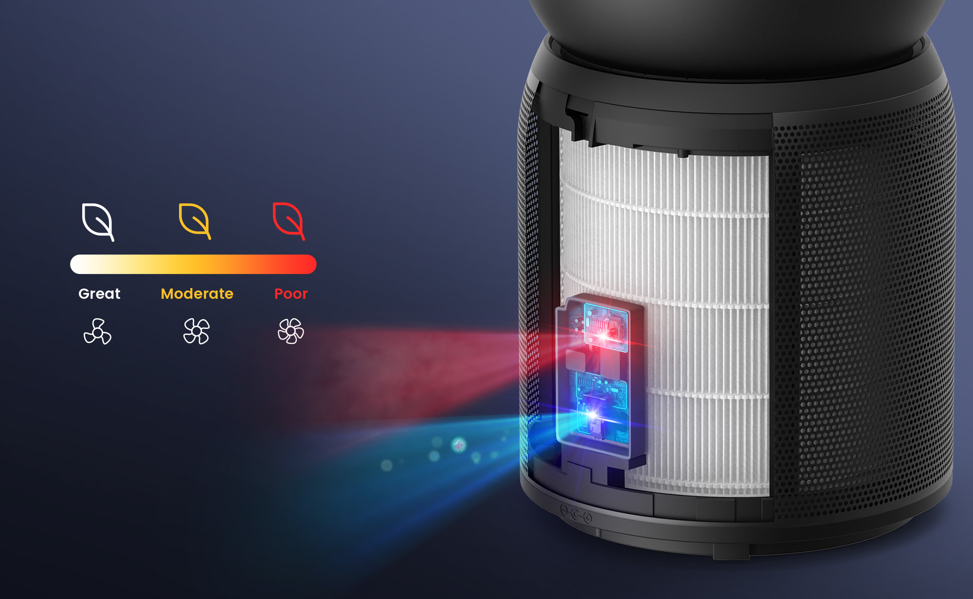 The laser sensor and the VOC sensor detects the particulate matter and volatile organic compounds in the air, such as cigar smoke, and pet odors. The three-color air quality indicator provides a clear view to help you check the air quality around you. Automatic mode to adjust the fan operating speed according to the real time air quality.