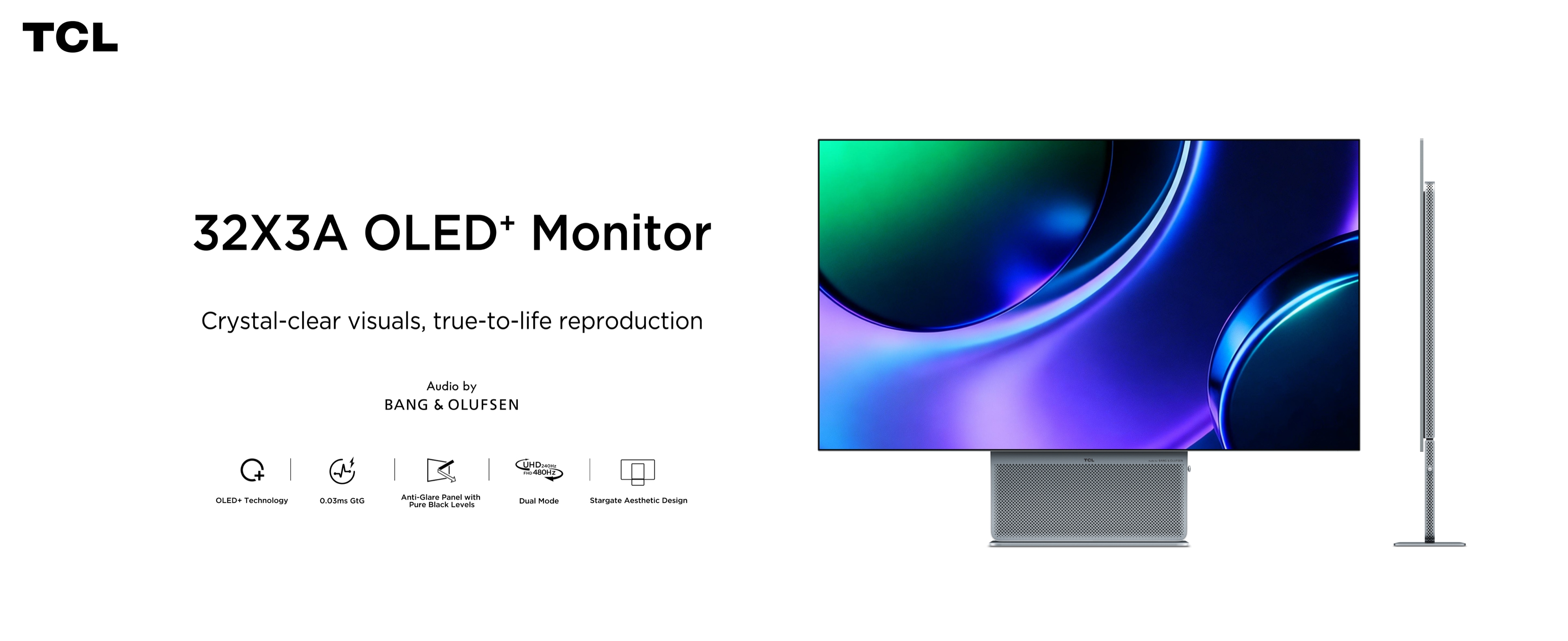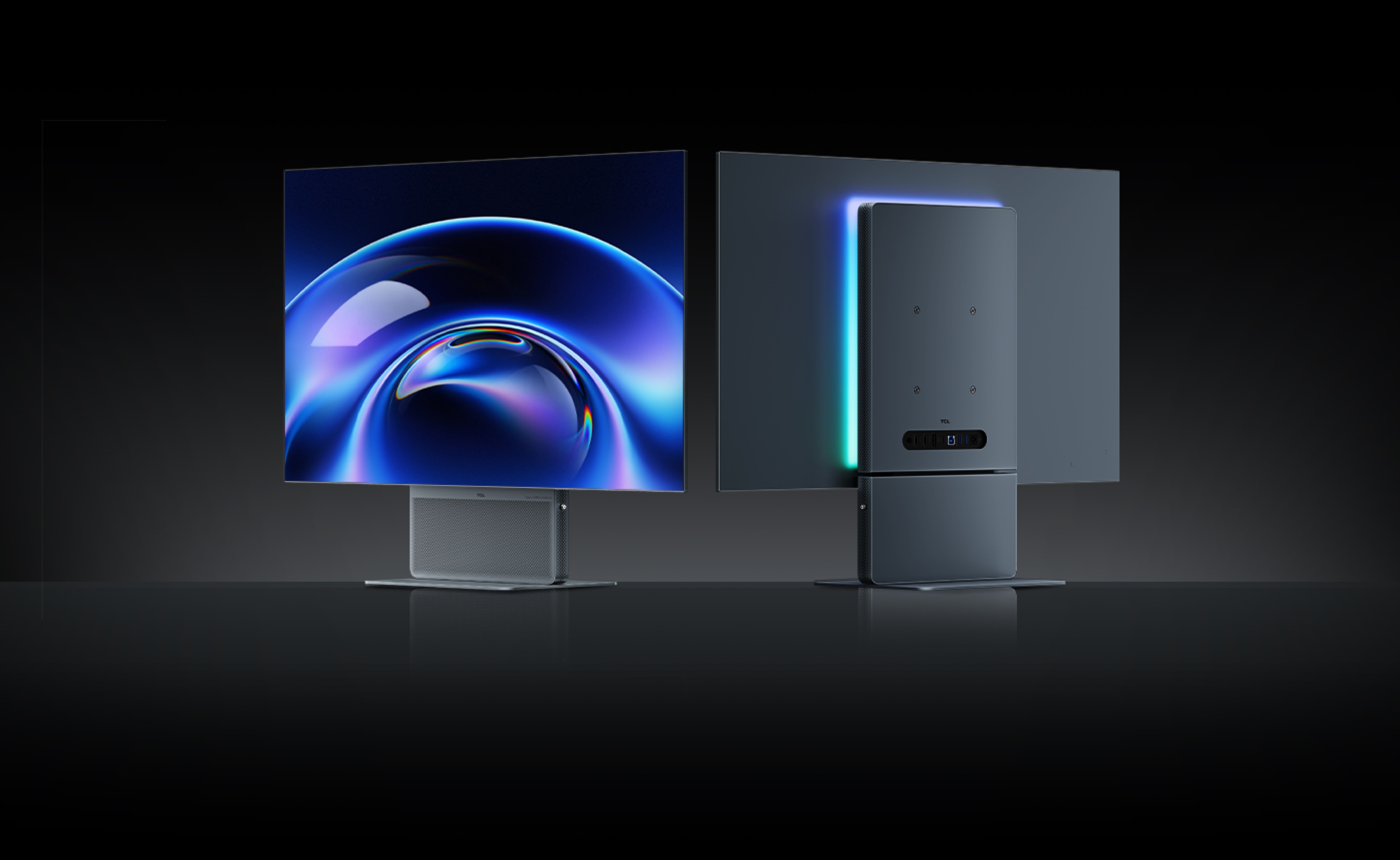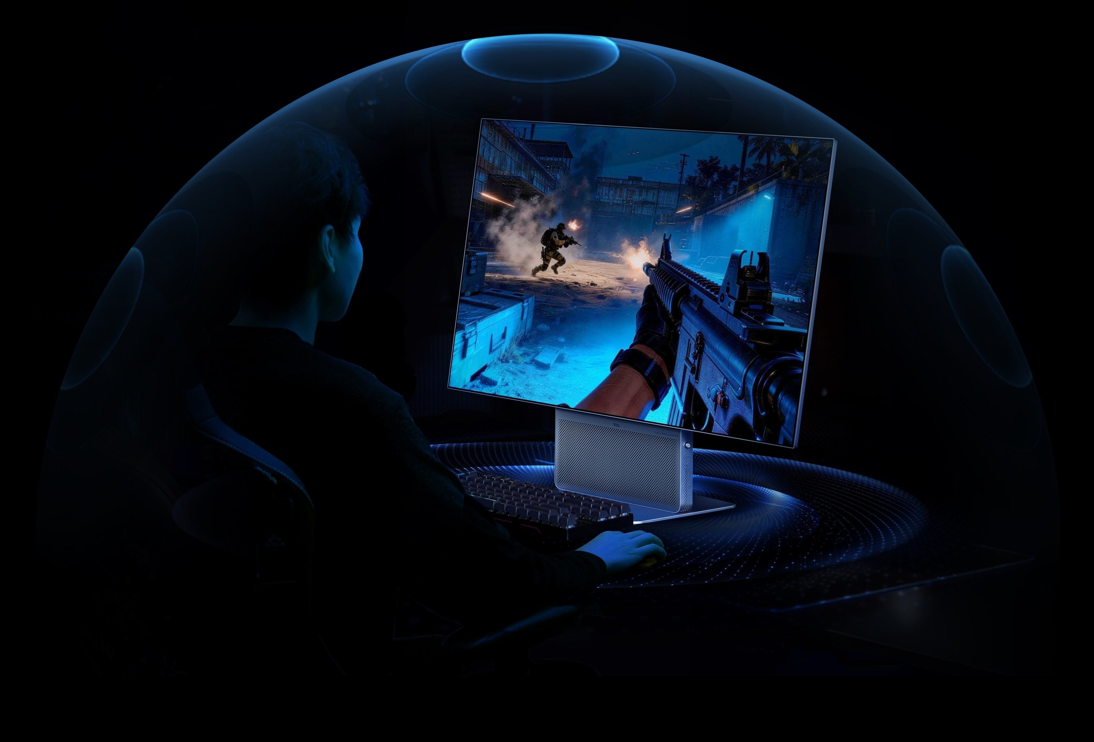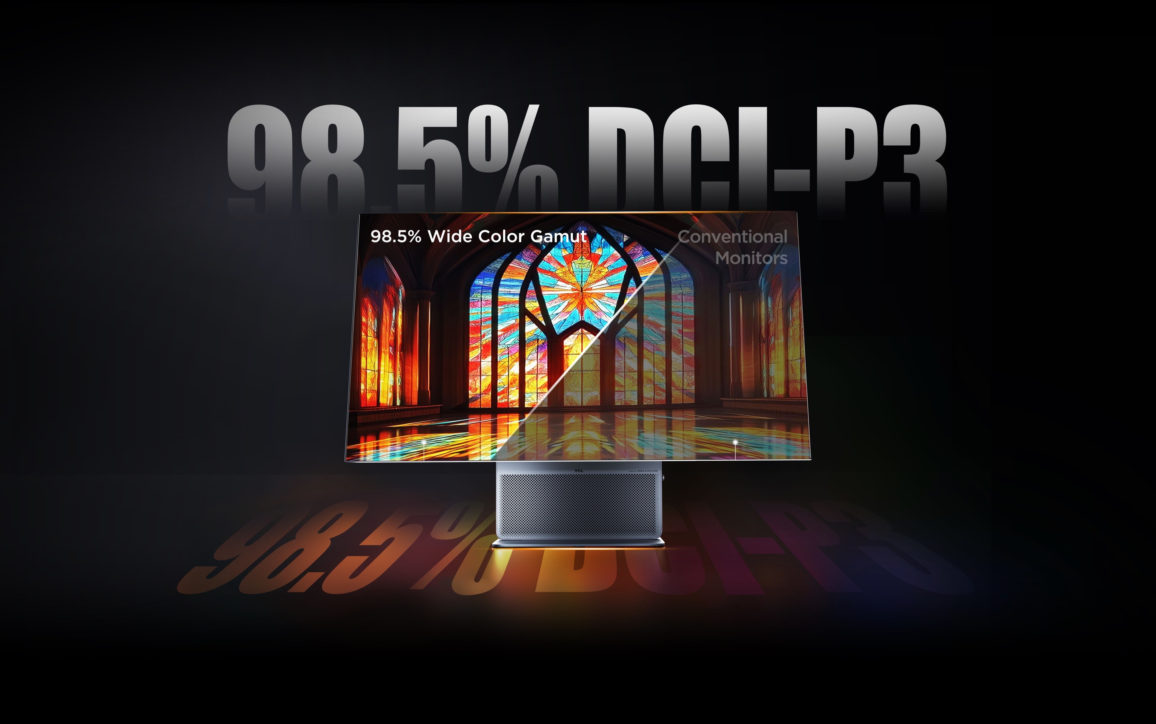 TCL's first integrated front-firing monitor design. Unlike traditional downward-firing speakers, sound travels directly toward you without reflecting off the desk surface. By reducing reflection loss, audio remains clearer and more accurate, creating a dedicated desktop soundstage.