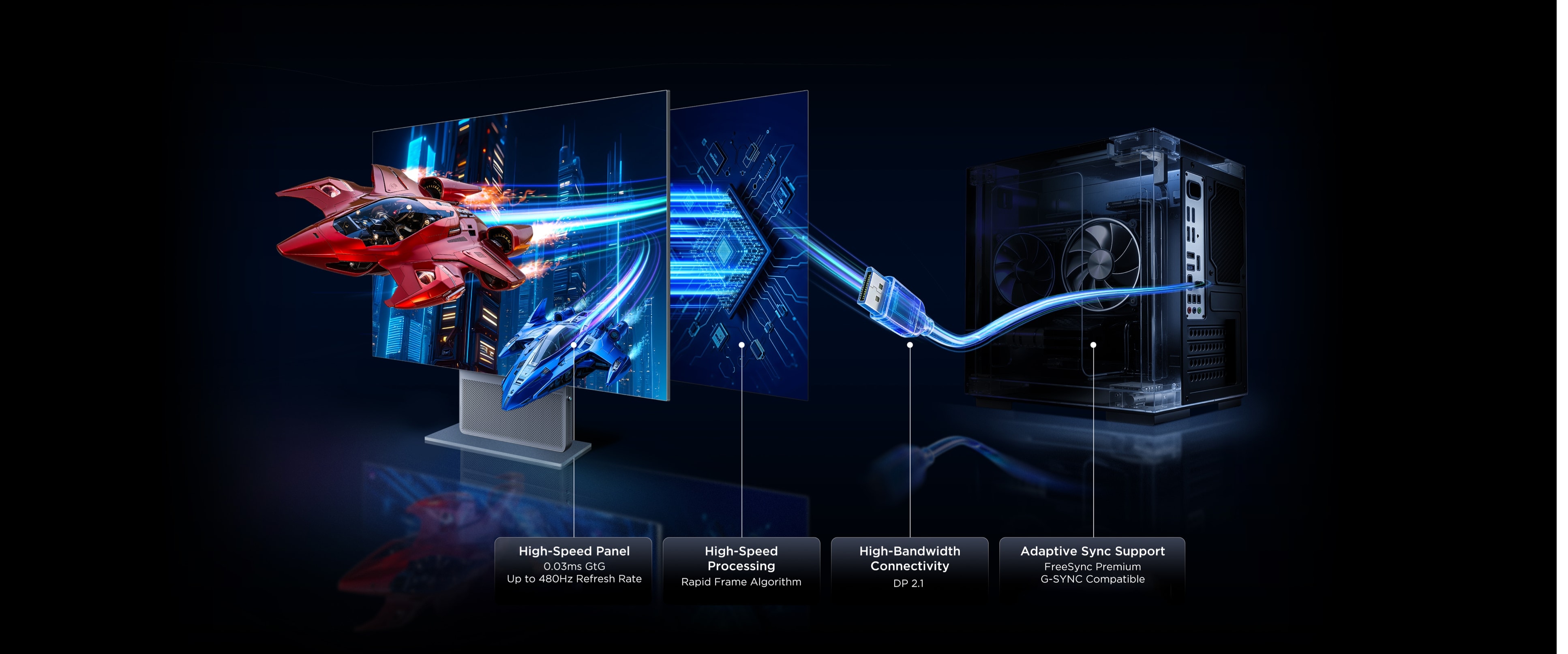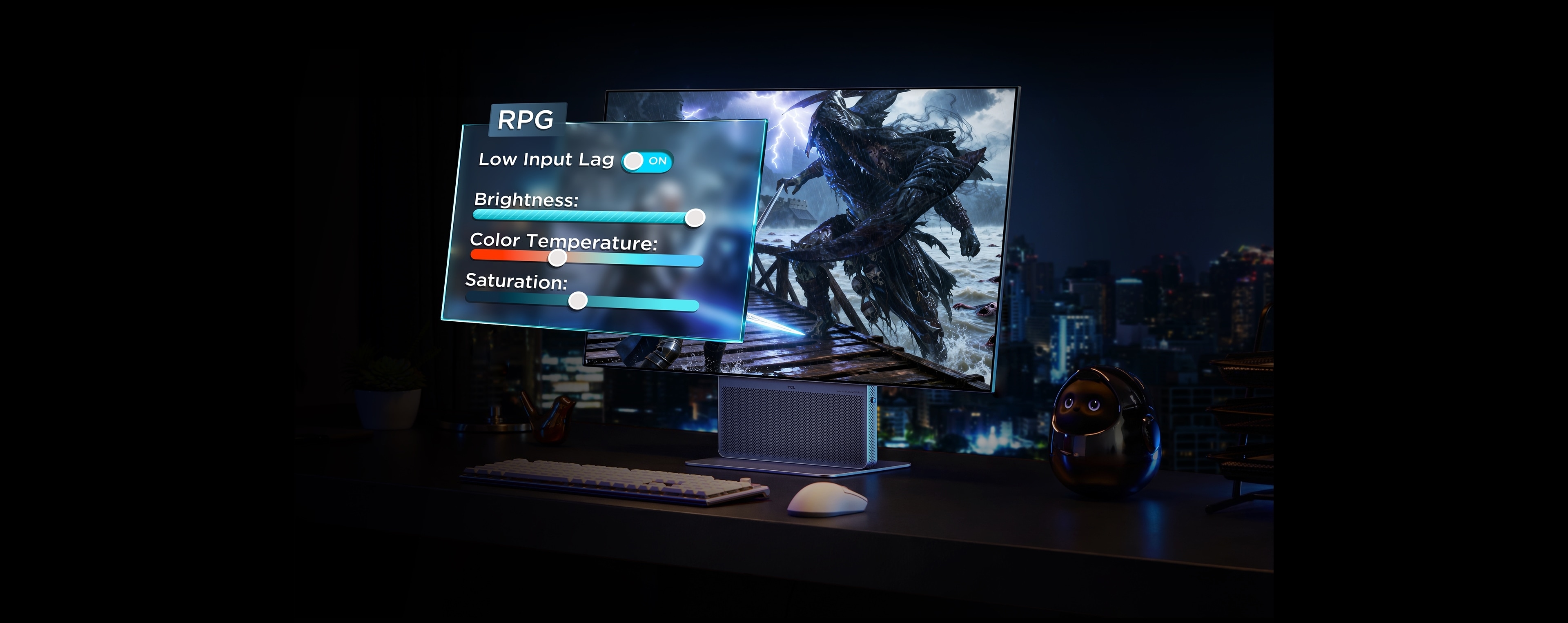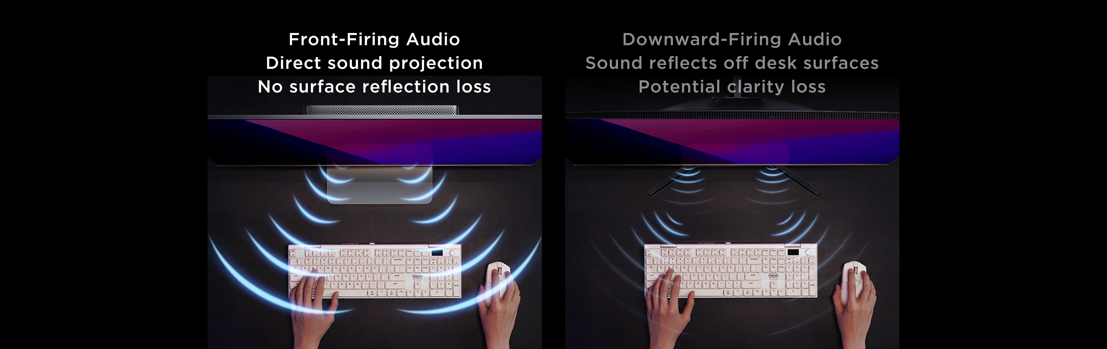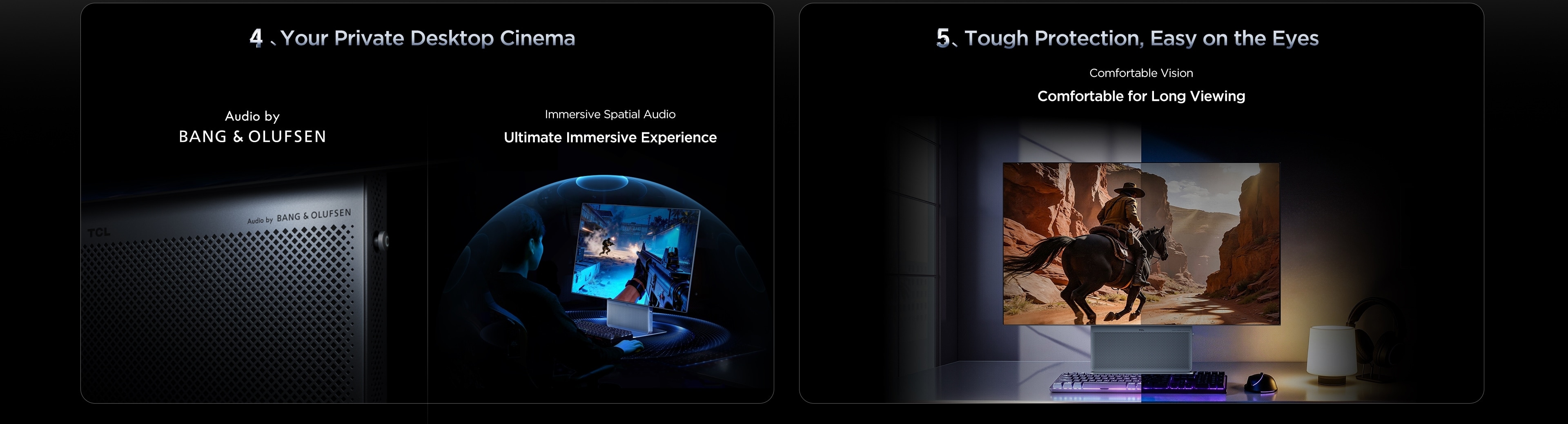 TCL's first integrated front-firing monitor design. Unlike traditional downward-firing speakers, sound travels directly toward you without reflecting off the desk surface. By reducing reflection loss, audio remains clearer and more accurate, creating a dedicated desktop soundstage.