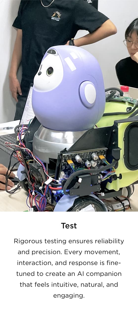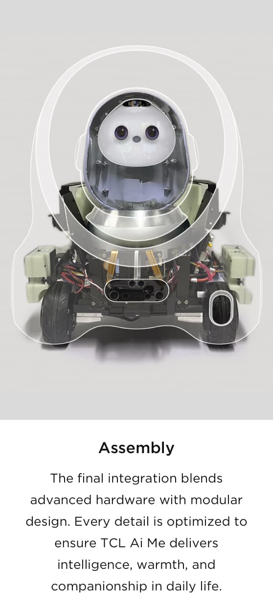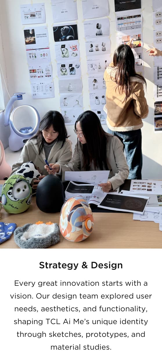 At its core, TCL AiMe is a companion, listener, and friend, designed to bring emotional value into daily living. From sketches to prototypes, we’ve always believed that TCL AiMe’s physical presence could spark deeper connections and create genuine moments of joy. By merging hardware and software, engineers and designers collaborate closely to integrate advanced technology with emotional intelligence, ensuring a smooth, responsive experience. Emotional innovation lies at the heart of TCL AiMe, infusing each iteration with empathy and prioritizing well-being to make each interaction feel personal and meaningful. Through our human-centered process, we continually refine the design, making TCL AiMe more than just a robot—it becomes a companion offering genuine friendship, gentle assistance, and a comforting presence whenever needed.