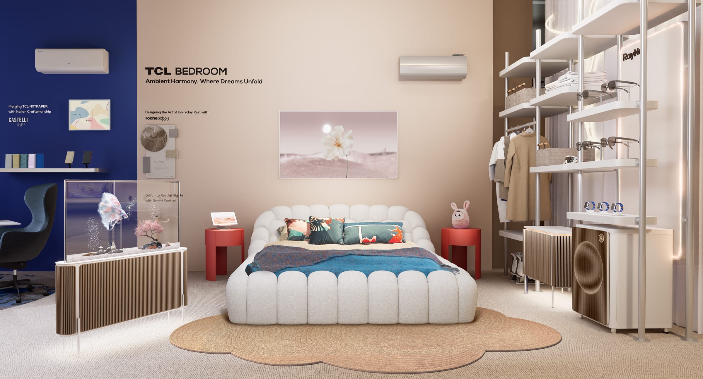 Subtle conveniences—a transparent display, a modular air purifier, and a discreet mini-bar refrigerator—complete the intelligent yet restful ambiance. TCL ECORA™ accessories, crafted from reclaimed ceramic fragments, bring tactile accents that root the space in memory, material, and story.