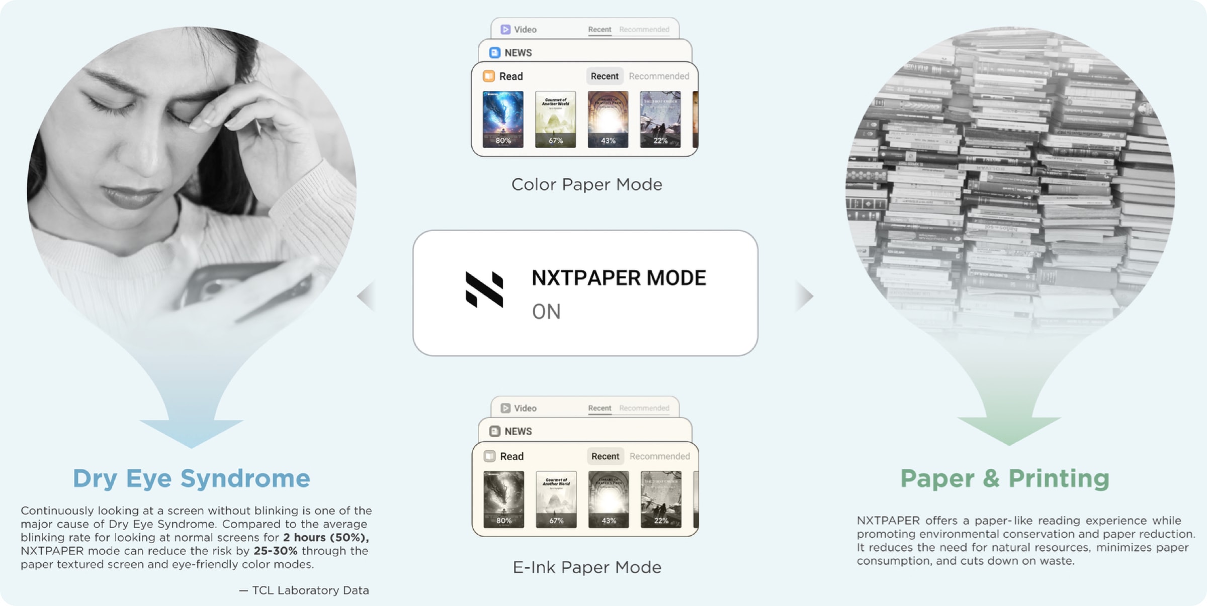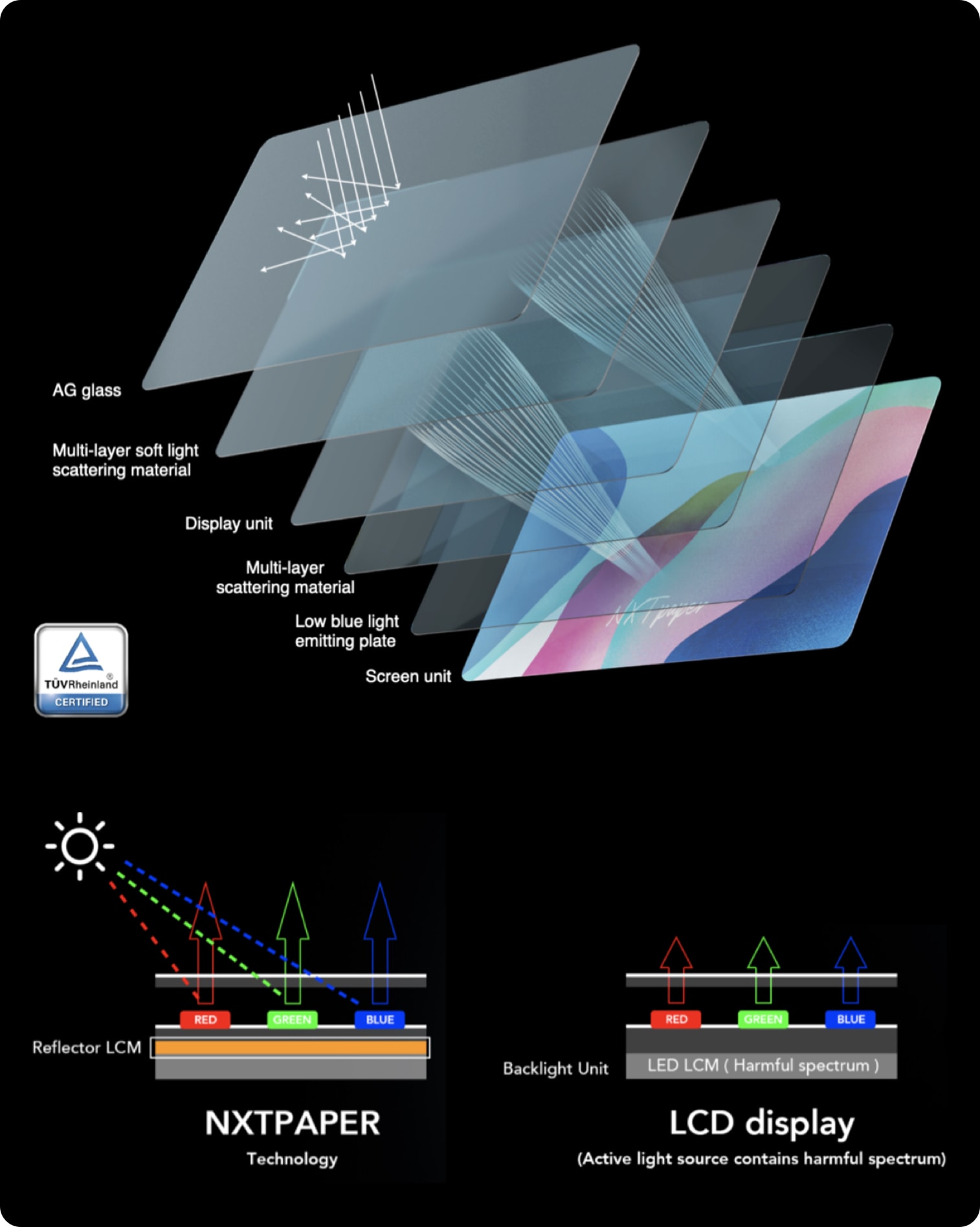 NXTPAPER is an innovative display technology that significantly reduces harmful blue light and glare from digital device screens by simulating the propagation path of natural light, presenting a paper-like user experience with the following features: