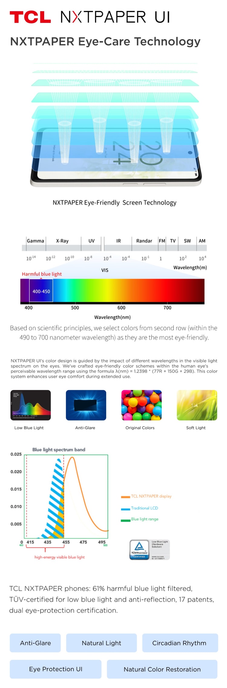 3. Blue Light Management: Unlike ordinary mobile devices, NXTPAPER devices adjust the LED blue light spectrum, shifting the blue light peak to a safer band of 457~462.5nm, reducing the proportion of harmful blue light. Compared to traditional LCDs, NXTPAPER reduces harmful blue light by up to 61%. This technology not only effectively avoids the harm of short-wavelength blue light (415nm~455nm) to the eyes but also ensures color accuracy without yellowing or reducing the beneficial blue light that regulates the human body's circadian rhythm, ensuring a balance of user safety and comfort.
