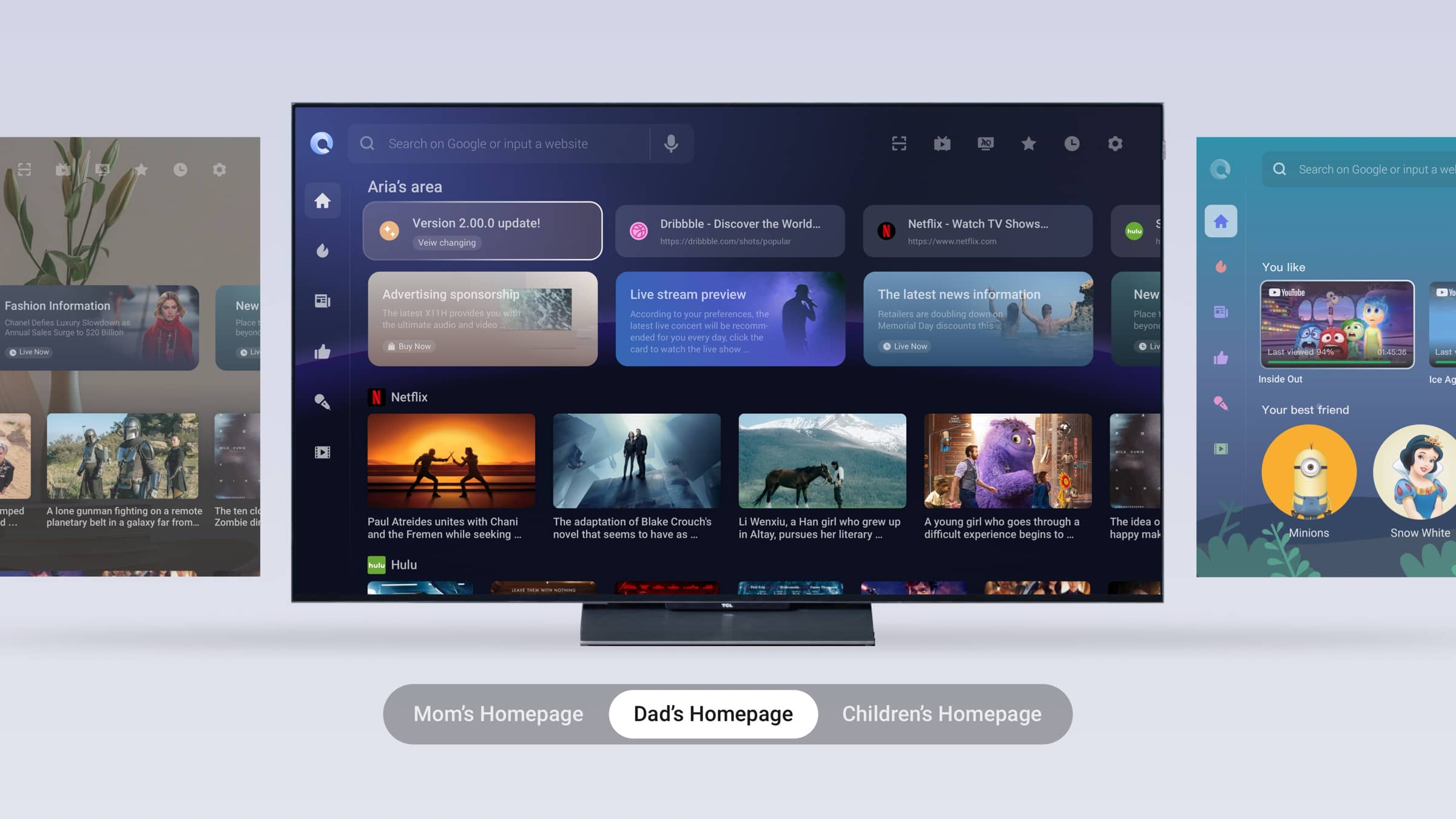TCL BrowseHere's multi-account family feature offers unique UI themes for each member, providing a refreshed visual experience with each switch. Users can subscribe to content based on personal preferences, receiving personalized recommendations. To address TV input difficulties, we integrated advanced voice capabilities, enabling accurate searches through vague voice descriptions. For better web interaction on TV, we designed a convenient toolbar based on frequent user actions, allowing quick web browsing with a single remote control button.