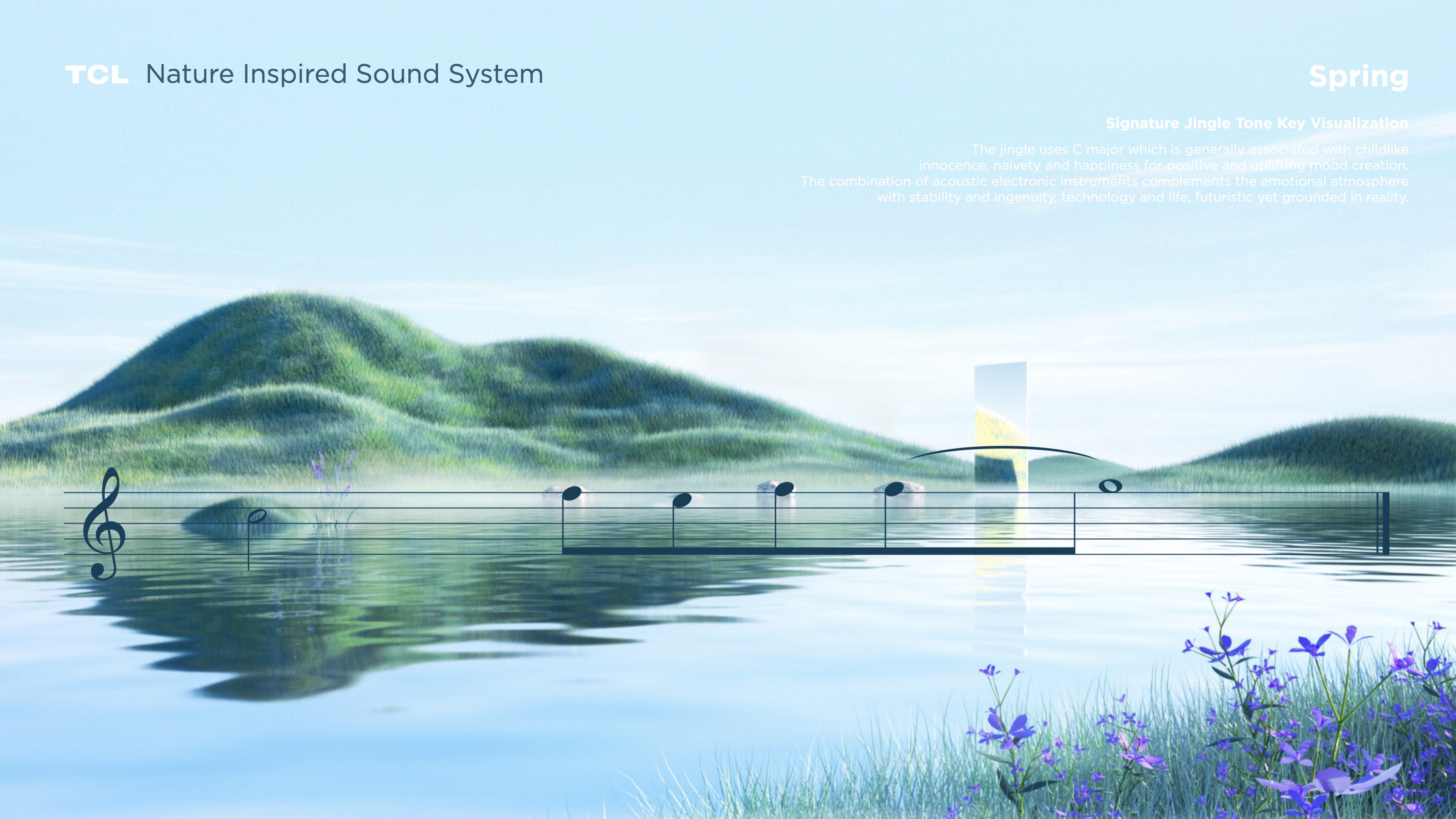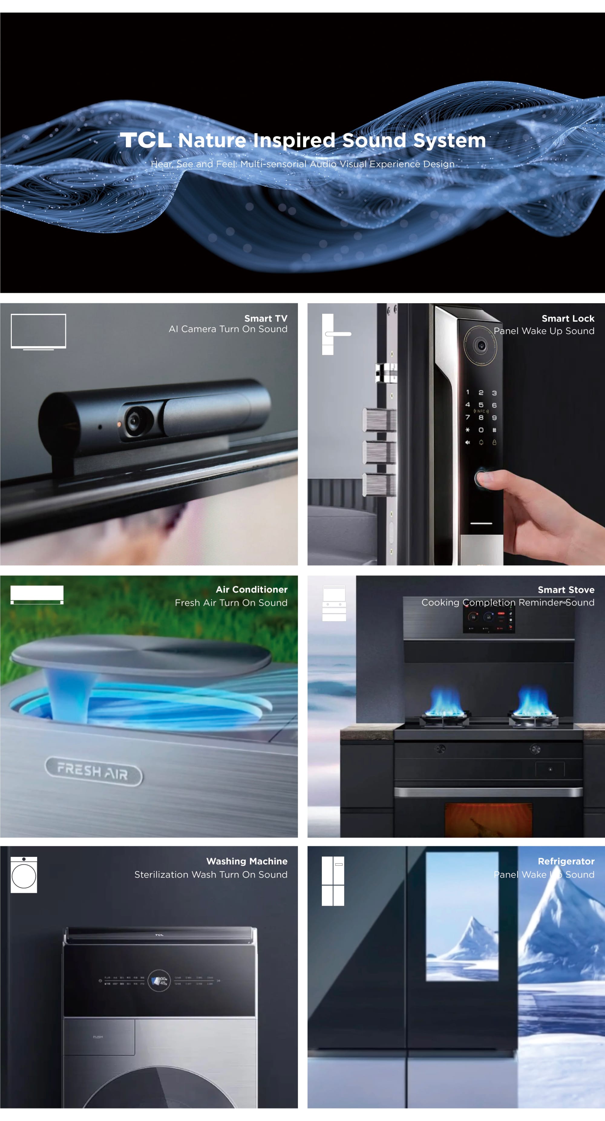 The post-pandemic new normal has made users eager to get away from their stressful daily life to embrace nature for healing their hearts and soul. This determines the theme of the TCL Nature Inspired Sound design story. We enrich and unify the user experience across TCL's full-set AIxIoT product series (TV, refrigerator, air conditioner, washing machine, smart lock, smart stove). We take inspiration from Nature Water Eco-cycle and nature elements to connect with cross-category product attributes to form a complete design story to take our users on a multi-sensorial user experience journey connecting our products with the comfort of nature.