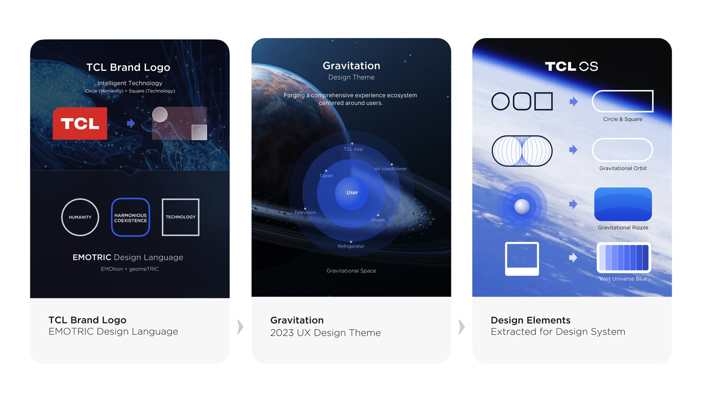 TCL OS embodies the TCL Brand Logo's manifestation "Technology & Humanity," aiming to unify the user experience across all product categories and software applications through a consistent design language. "Gravitation" is the design theme for TCL OS, drawing inspiration from universal gravity. Just as celestial bodies are interconnected by gravitational forces in the universe, the elements in the interface designs, such as icons and system controls, also have mutual attraction, creating a more organized and dynamic interface.