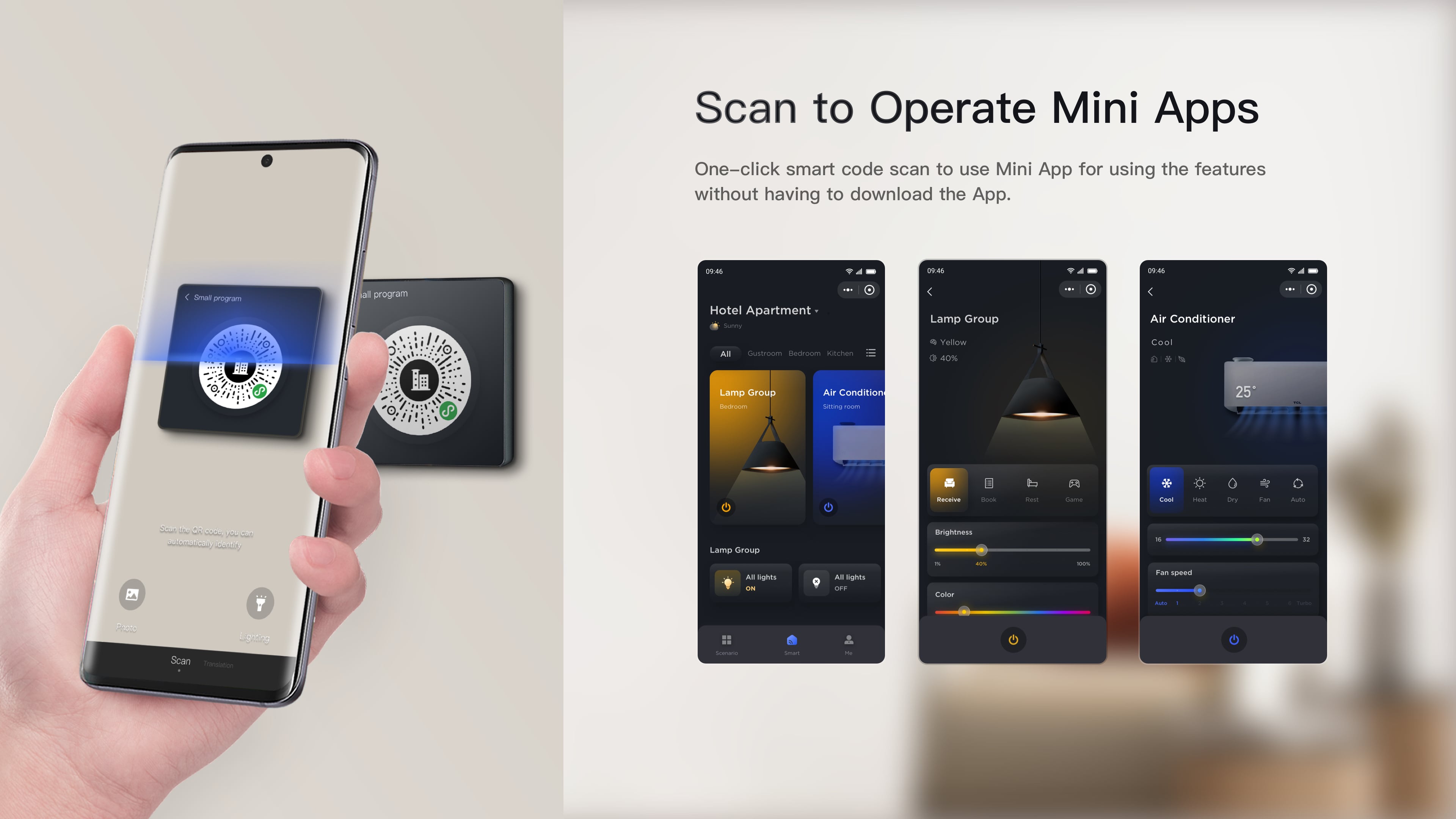TCL Smart Hotel IoT system provides an innovative solution for hotel owners to understand and plan smart systems for hotel rooms. Based on different room specifications, customized solutions will be automatically generated, largely saving the design and delivery costs. Hotel customers can open the system by scanning a QR code and have access to a collection of control modes. Through unified design language, light effects, and we create a vivid hotel room simulation in the application and provide an efficient and intelligent user experience.