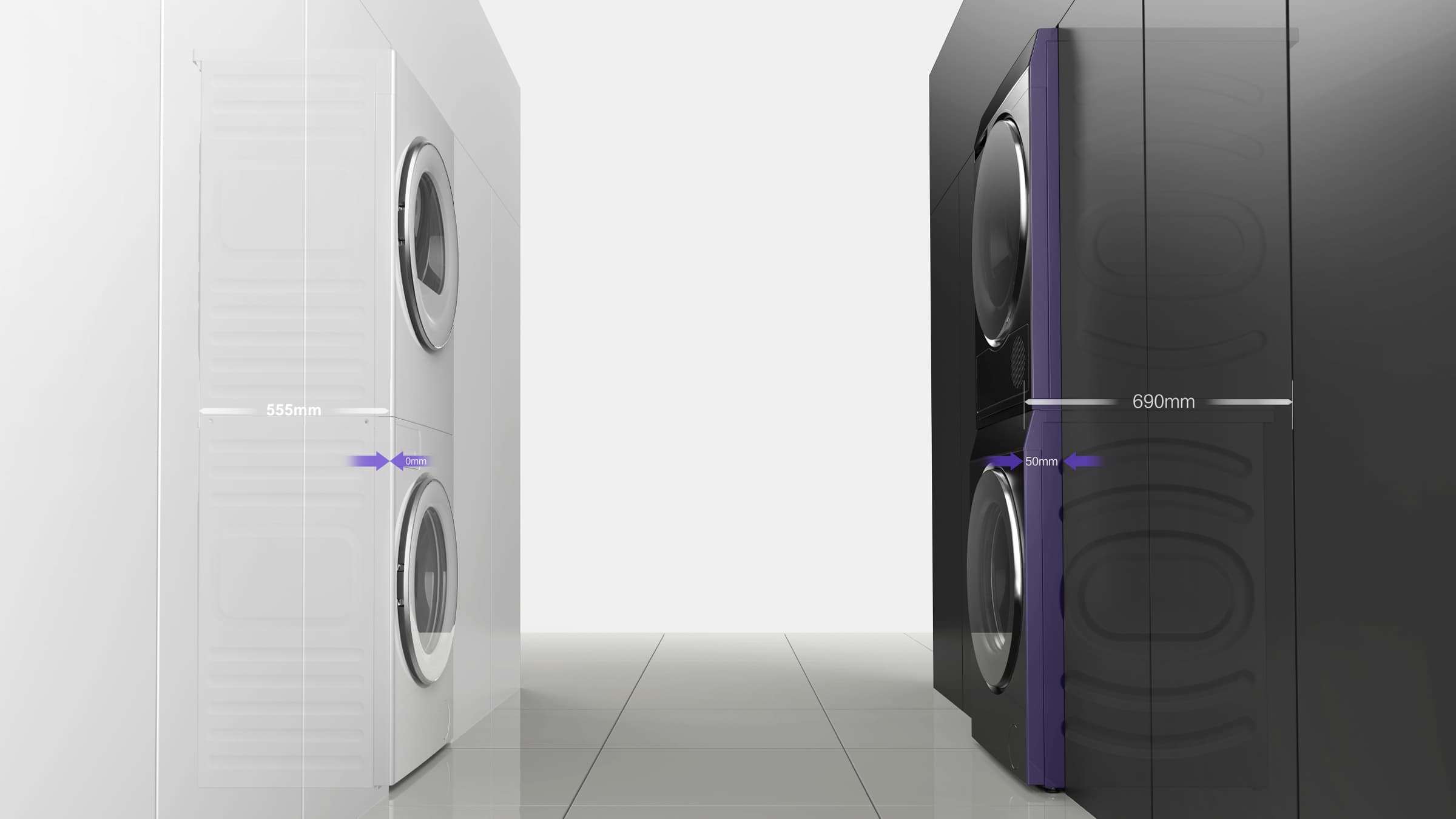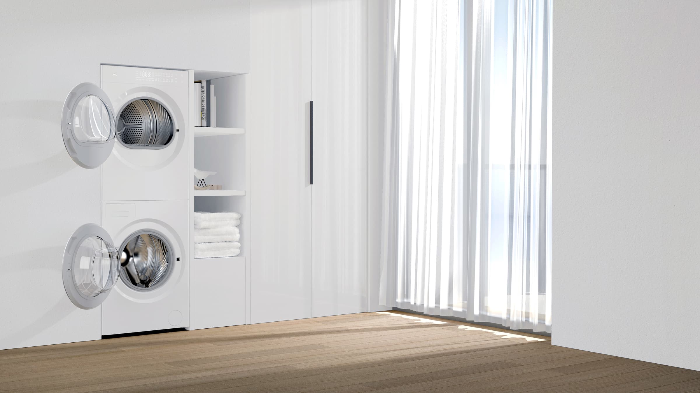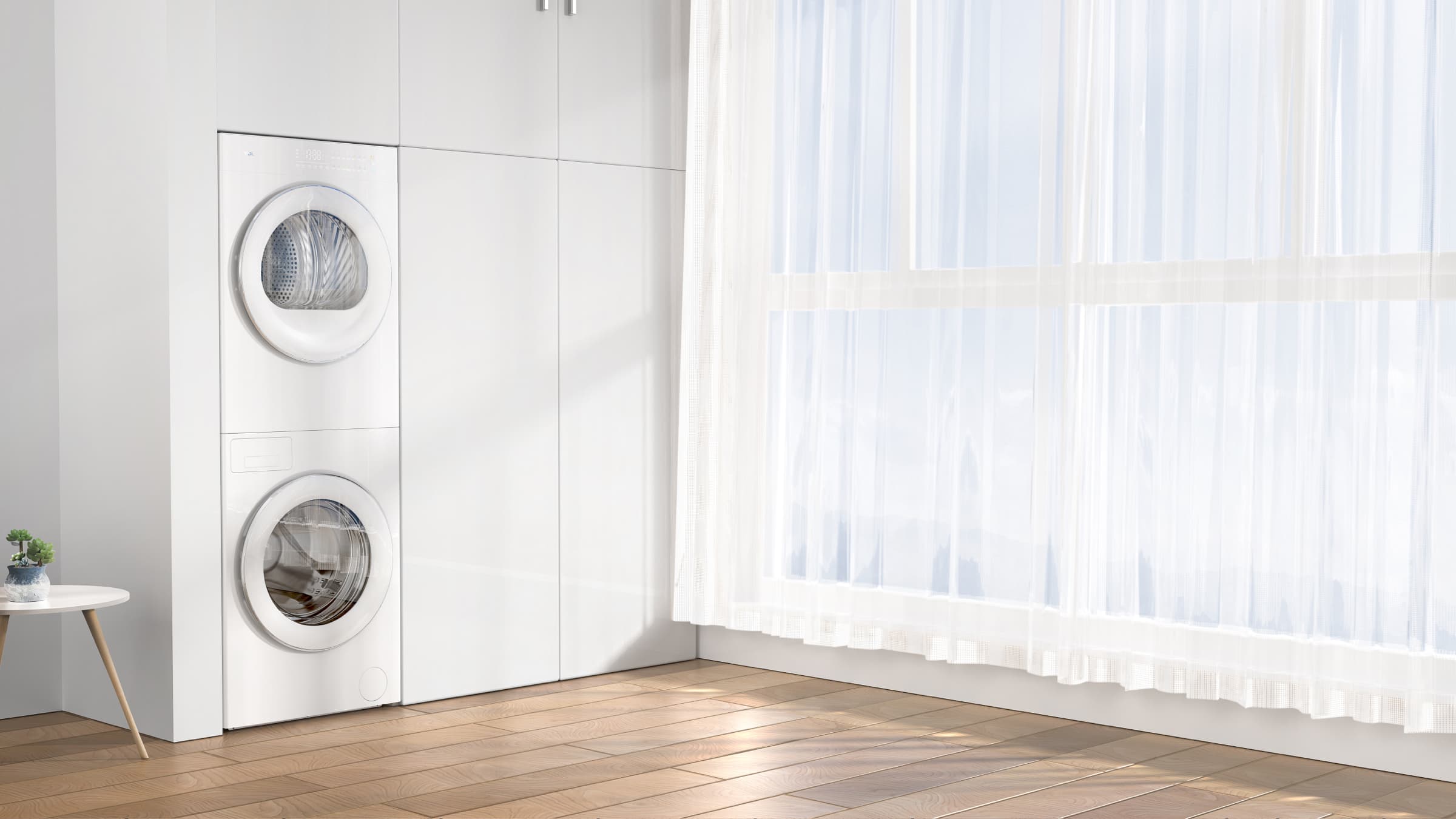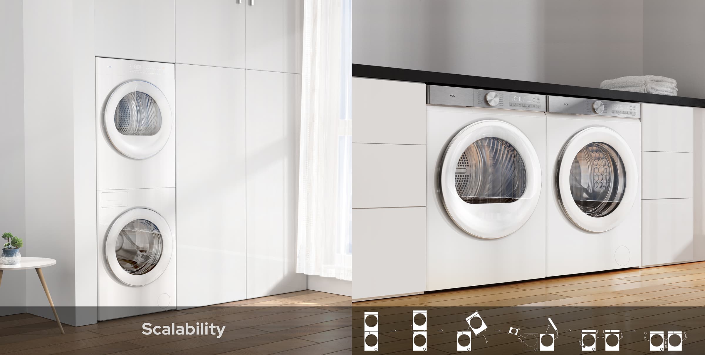 TCL Twin Drum Washing & Drying Set seamlessly combines washing and drying functions with innovative design. Its ultra-thin design offers a stylish, flush-front appearance, blending seamlessly into any living space. The Three-Dimensional Garment Care system, featuring six lifting ribs, elevates the washing process for both efficiency and clothing protection. Moreover, the platform effortlessly shifts between an all-in-one machine and modular suite configurations, minimizing adjustments and resource usage during development. This product embodies eco-consciousness and efficiency, making it an elegant, forward-thinking choice for laundry needs.