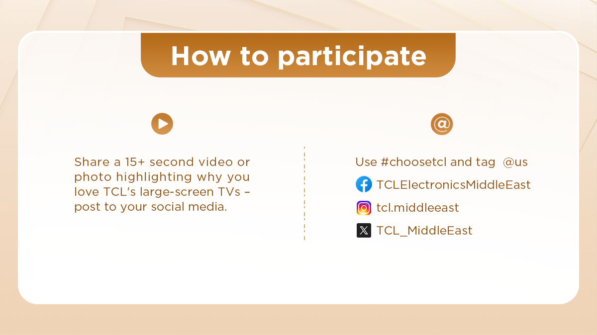 Join our #BigScreenMoment campaign to enhance your big screen experience! TCL invites you to share your unique experience with our latest big screen TVs. Whether it's a film night, a sporting event or a family gathering, we want to hear your story. Simply share your experience on your favourite social media channels for a chance to win fabulous prizes. Let's create your #BigScreenMoments, share your stories and show the world what your big screen moments are all about. We look forward to hearing from you!