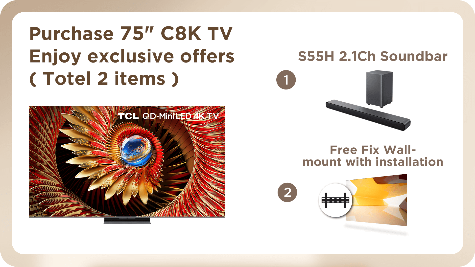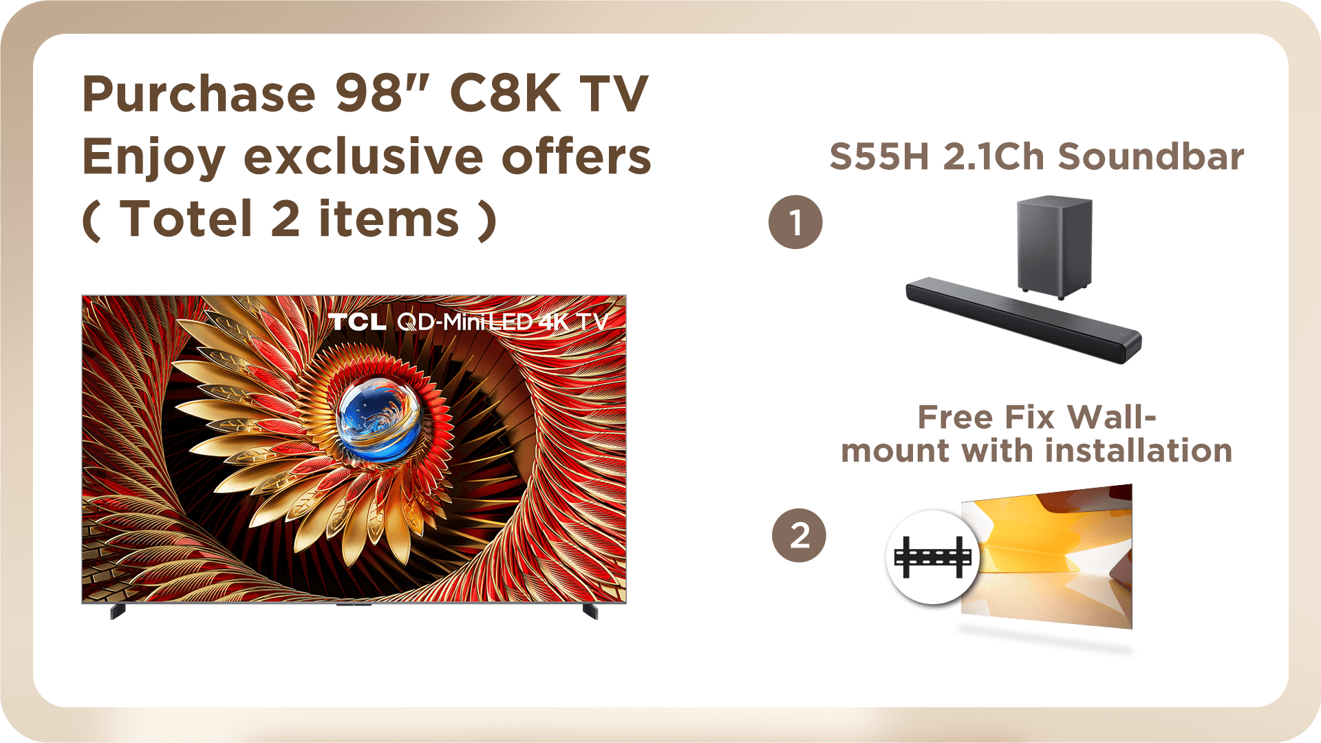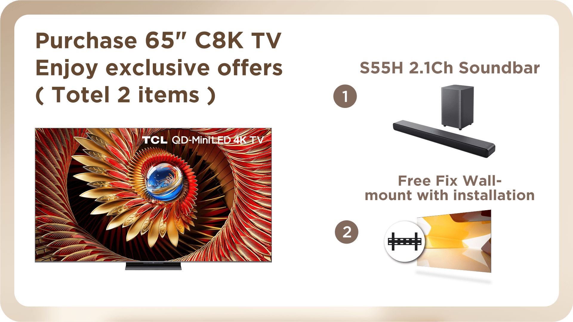 c) Purchase 98C8K / 85C8K / 75C8K / 65C8K / 85C7K / 75C7K / 65C7K / 55C7K TV, offer TCL S55H Soundbar and Fixed Wall-mount with installation service.
