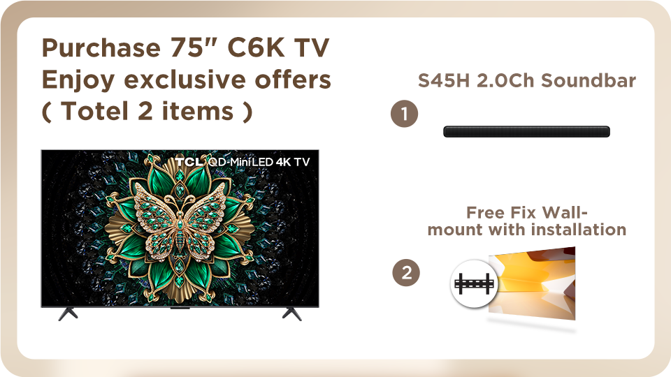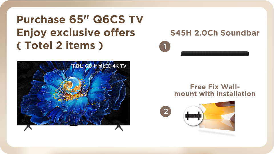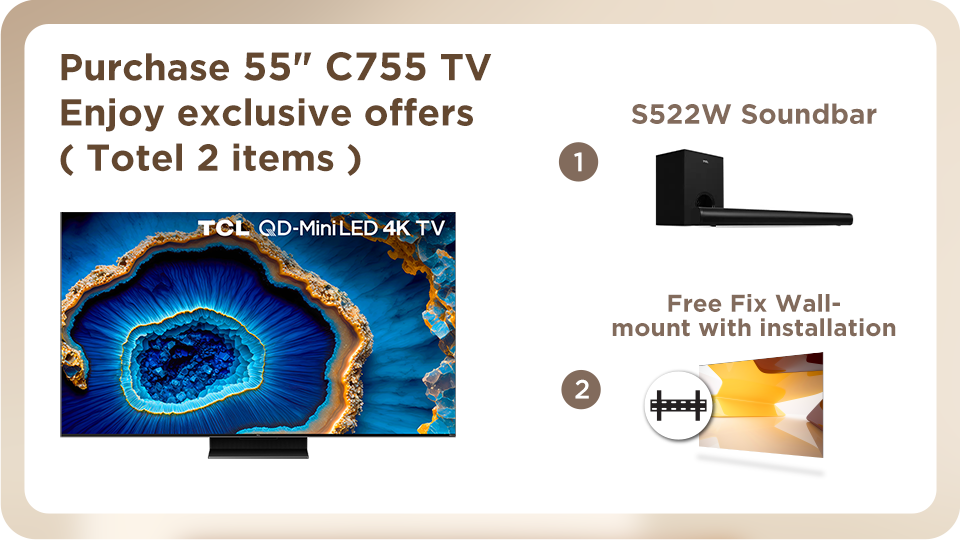 From now until 30 November, 2025, enjoy gift* of TCL soundbar and fix wall-mount with installation service by purchasing designated TCL XL collection TV from TCL authorized dealers.