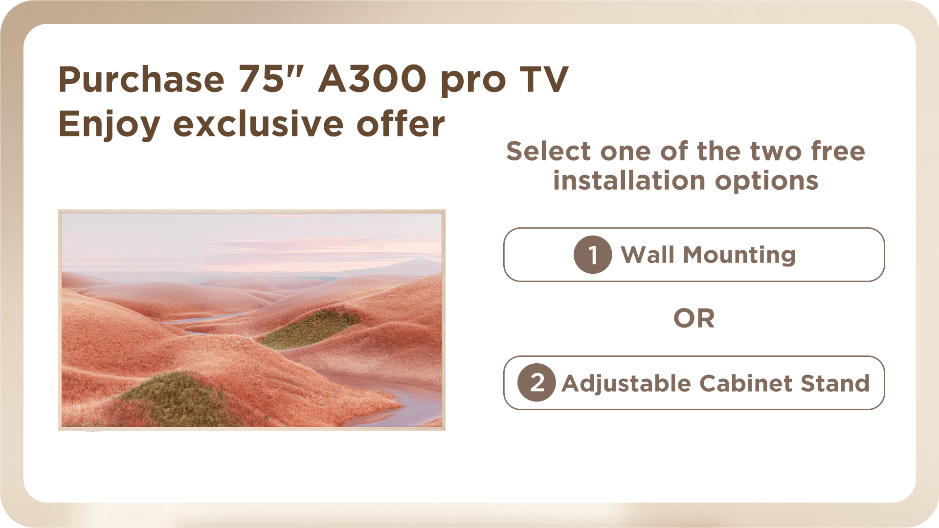 b) Purchase 75A300 Pro / 65A300 Pro / 55A300 Pro TV, offer Fixed wall-mount with installation service, or Adjustable Cabinet Stand with installation service.