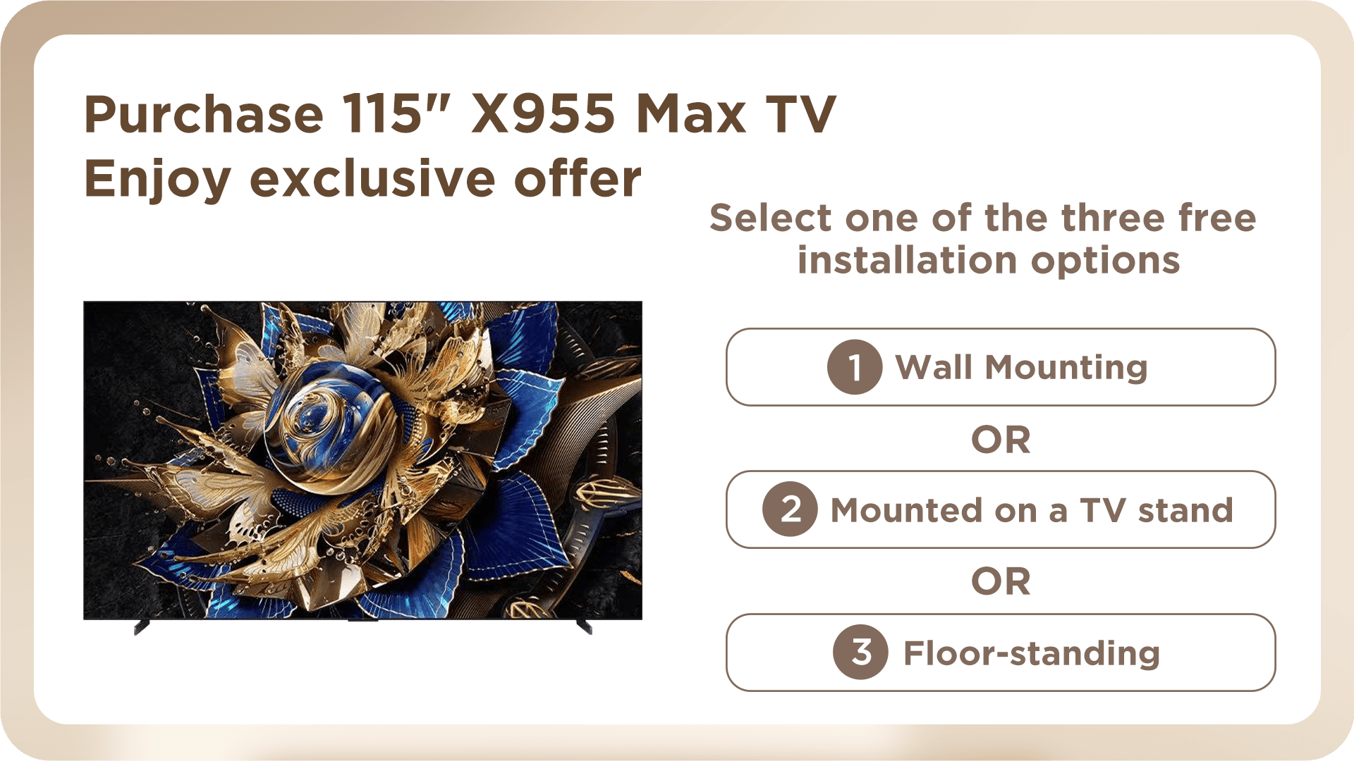a) Purchase 115X955 Max TV, offer Fixed wall-mount with installation service, or mounted on a TV stand with installation service, or Floor-standing with installation service.