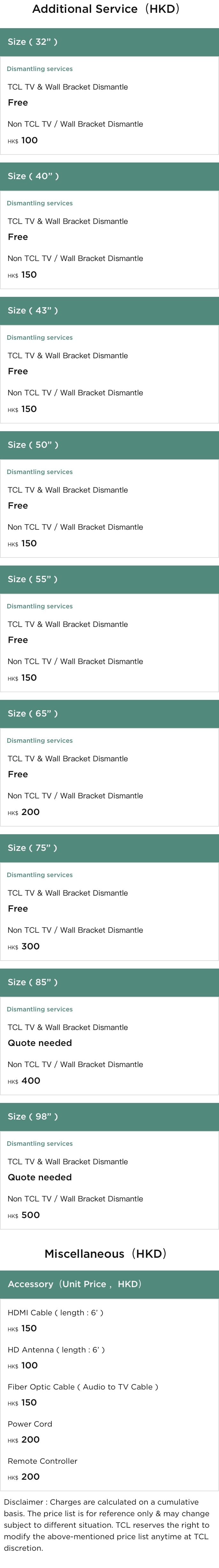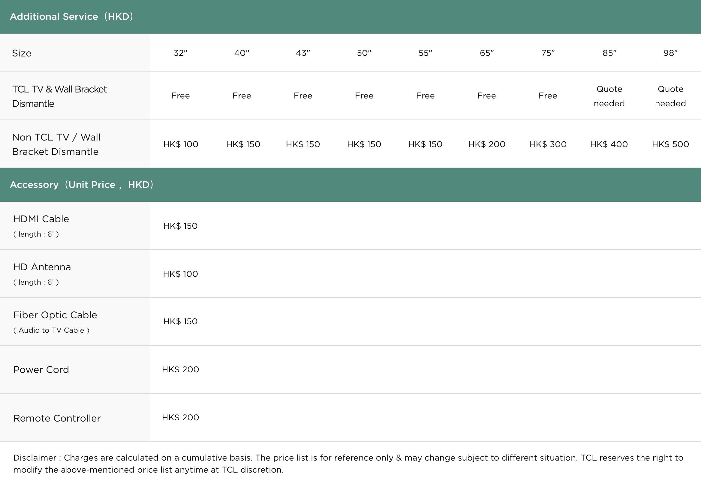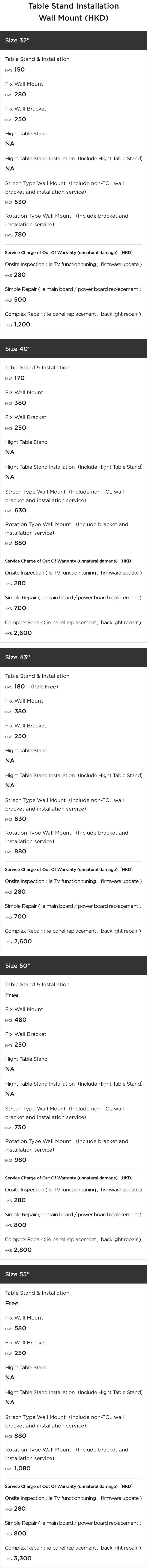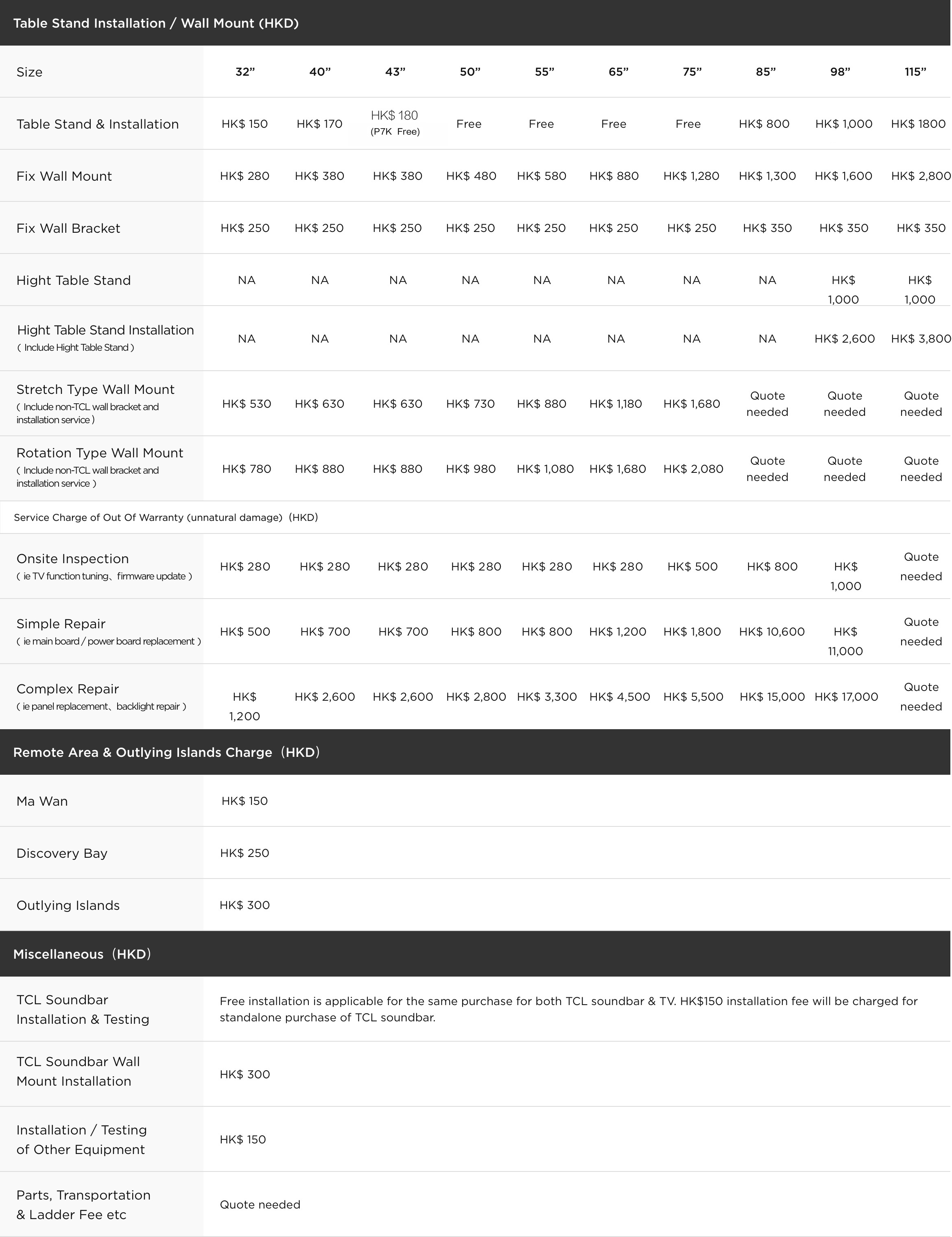 TV Installation and Repair Service Price List(Effective Date : 1-Nov-2024)