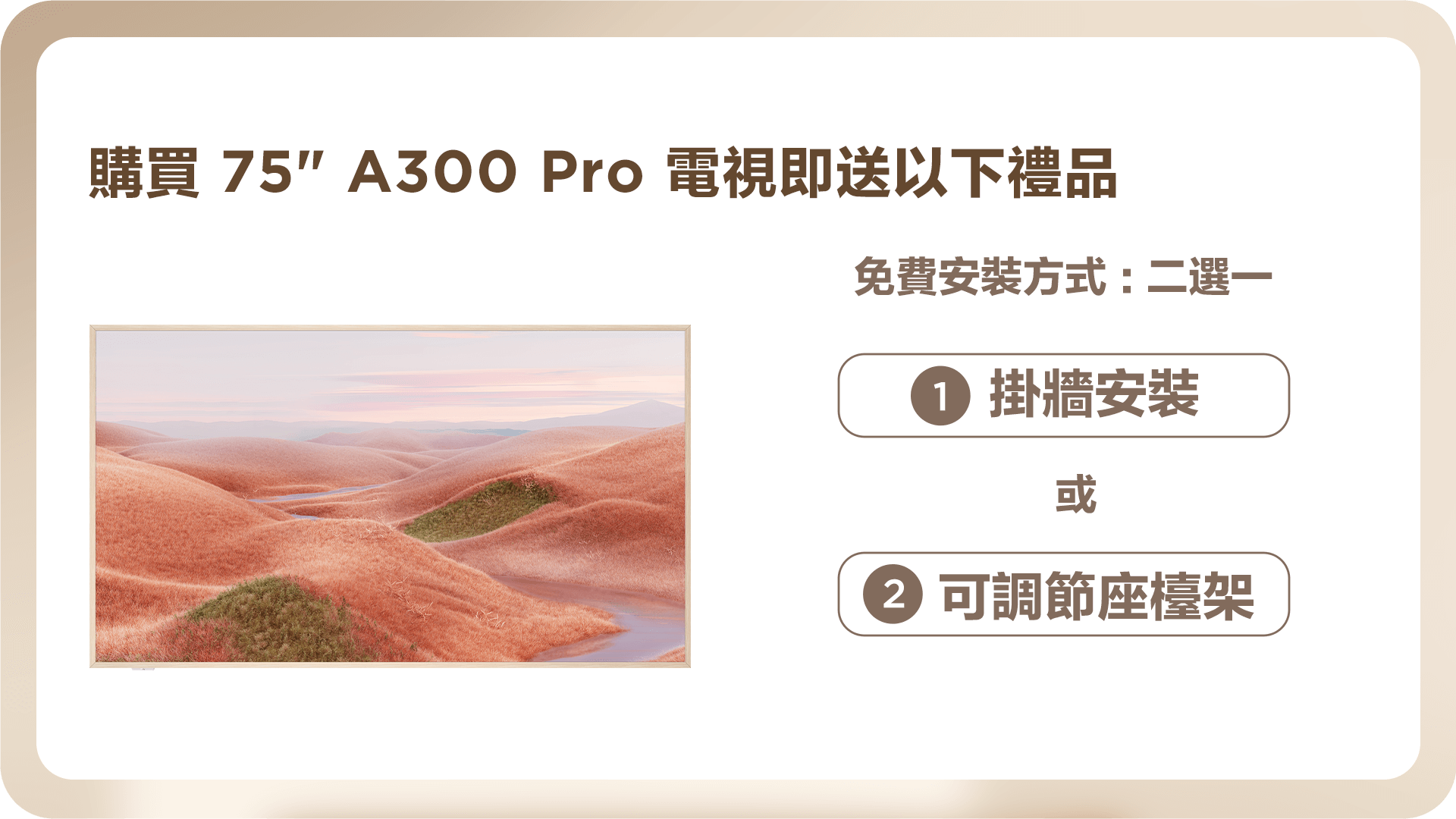 b) 購買75A300 Pro / 65A300 Pro / 55A300 Pro 電視,即送免費固定掛架連掛牆安裝 或 免費座檯安裝。