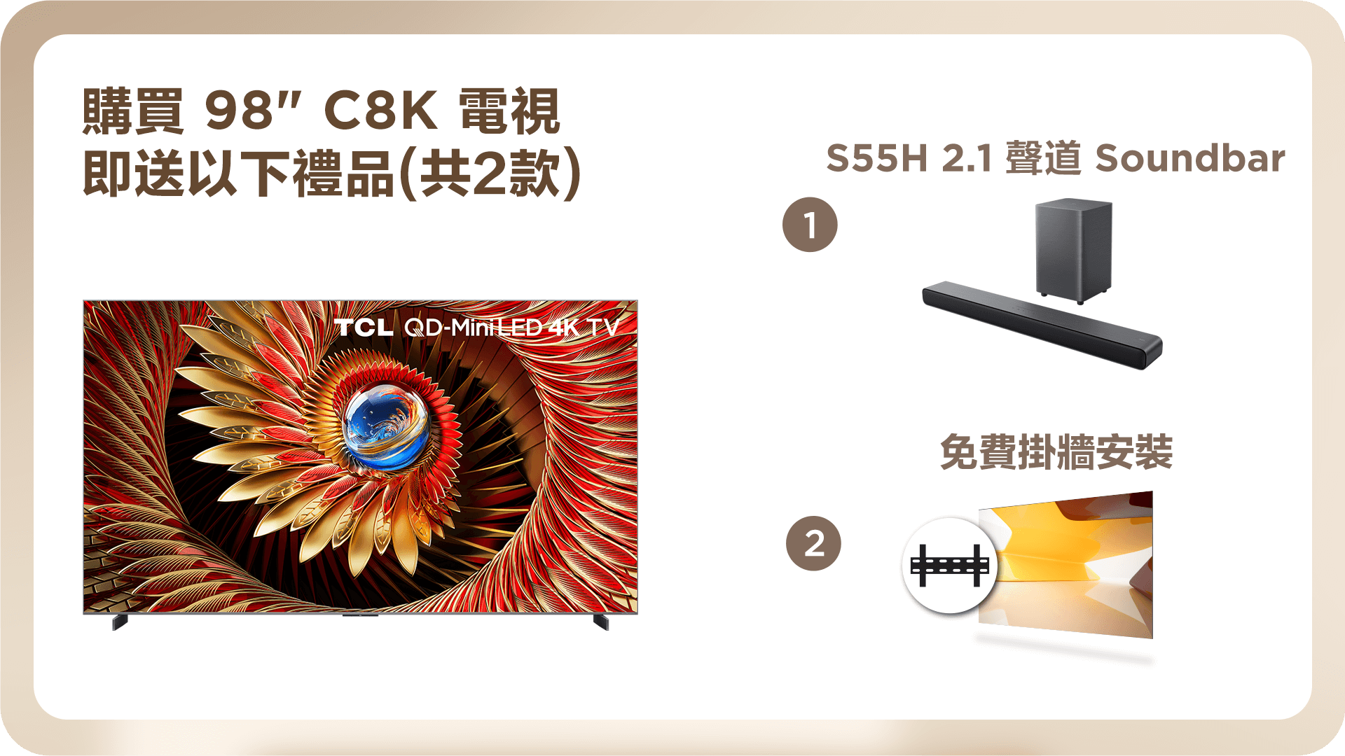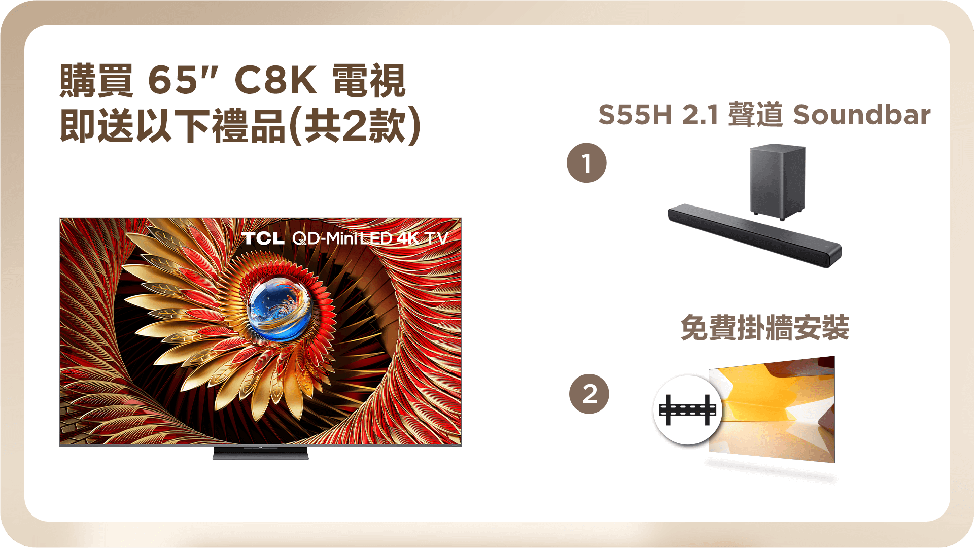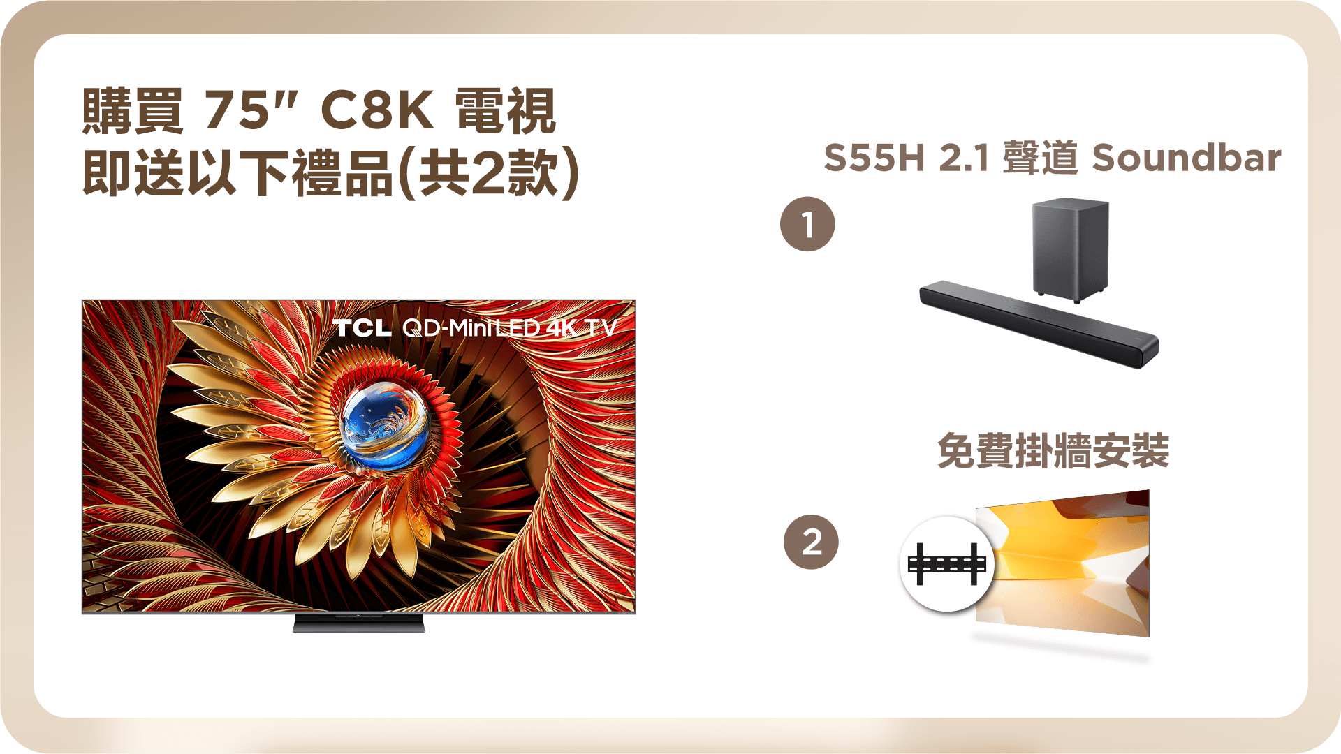 c) 購買98C8K / 85C8K / 75C8K / 65C8K / 85C7K / 75C7K / 65C7K / 55C7K ,即送TCL S55H Soundbar及免費固定掛架連掛牆安裝。