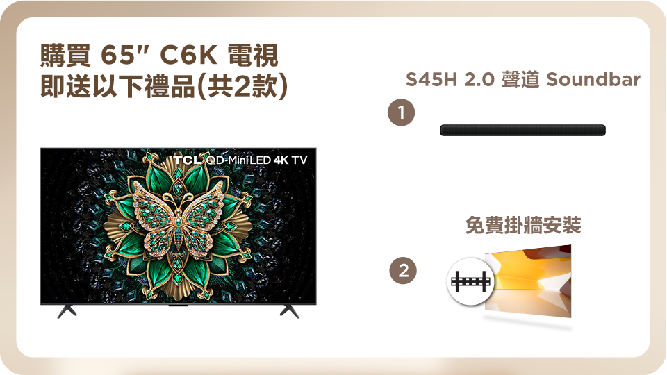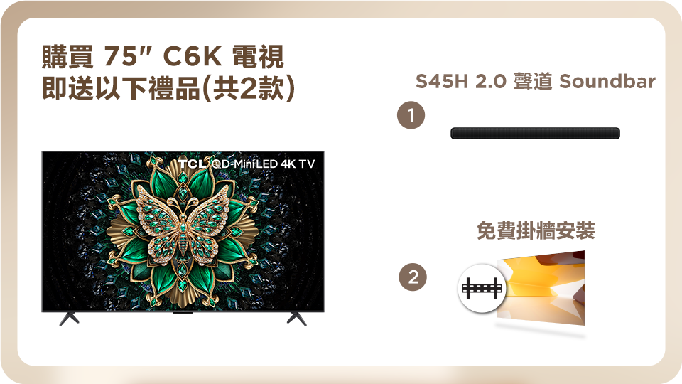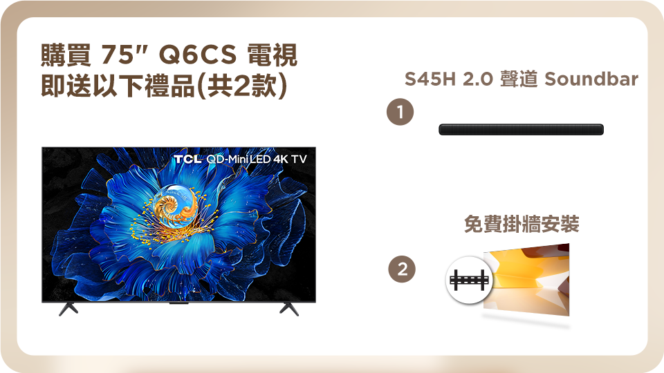 d) 購買75C6K / 65C6K / 75Q6CS / 65Q6CS,即送TCL S45H Soundbar及免費固定掛架連掛牆安裝。
