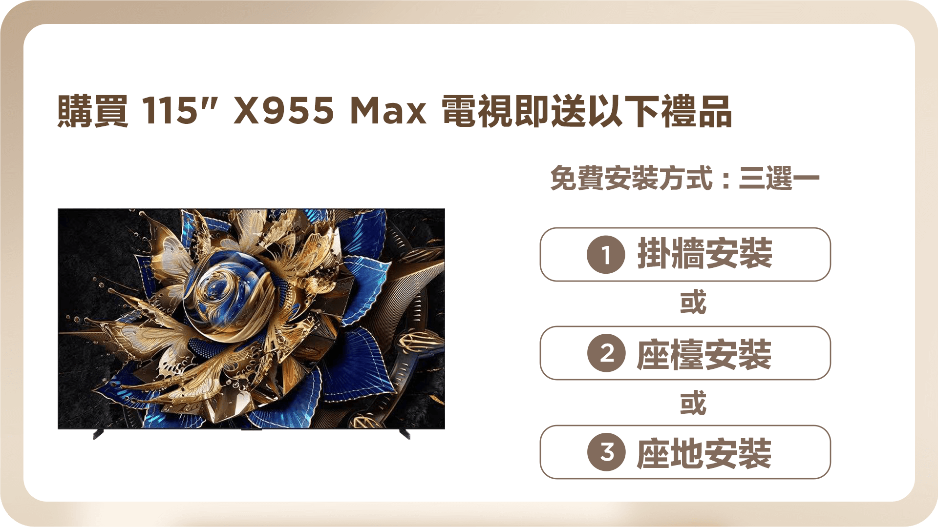a) 購買115X955 Max 電視,即送免費固定掛架連掛牆安裝 或 免費座檯安裝 或 免費座地安裝。