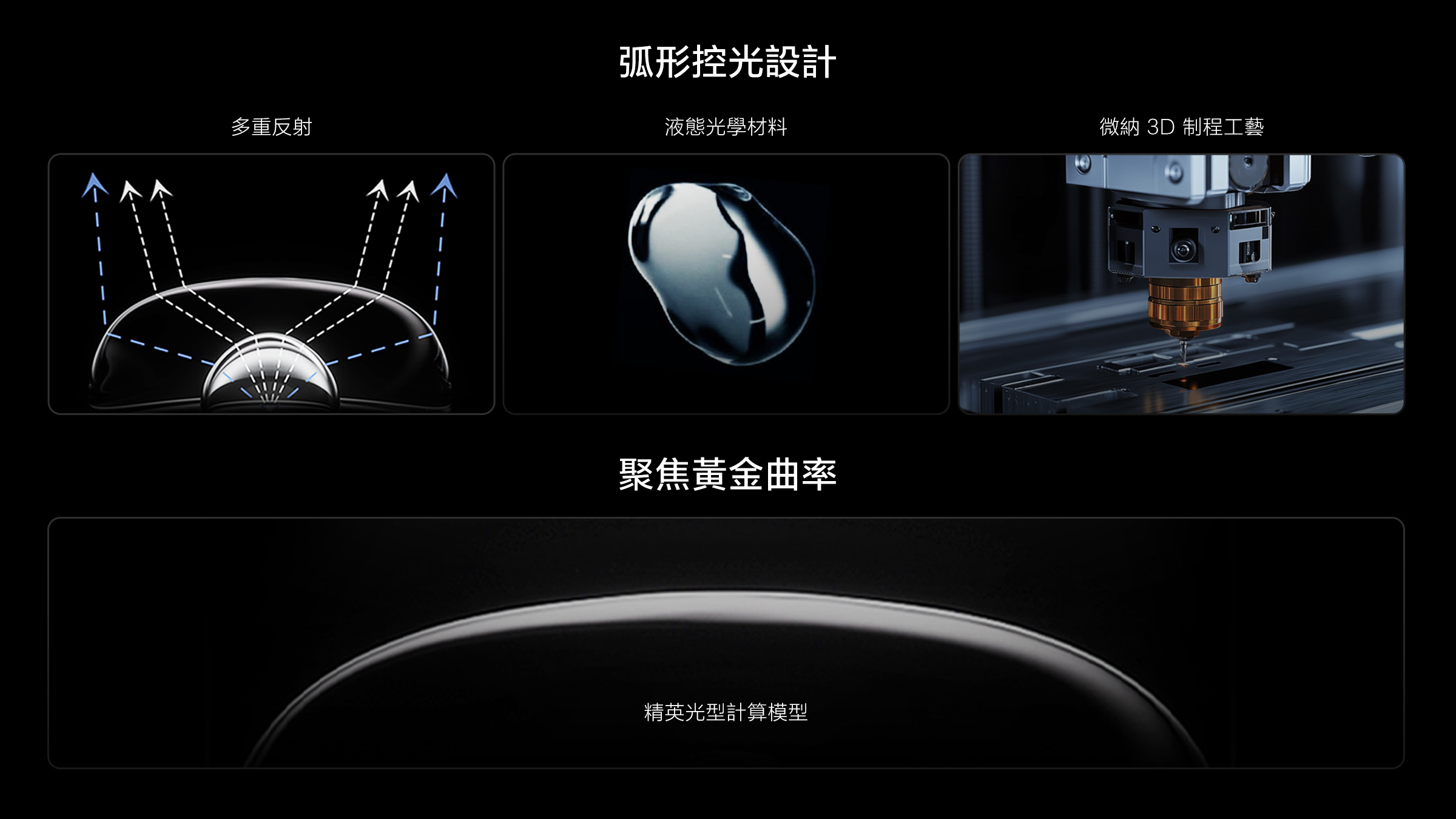 TCL 研發的聚光微透镜技術通過弧形設計精確控制光線方向。結合精密光學計算模型,形成具有超強聚光能力的黃金曲面,大幅提升背光均勻性能及光暈控制能力,帶來更清晰的畫面細節。